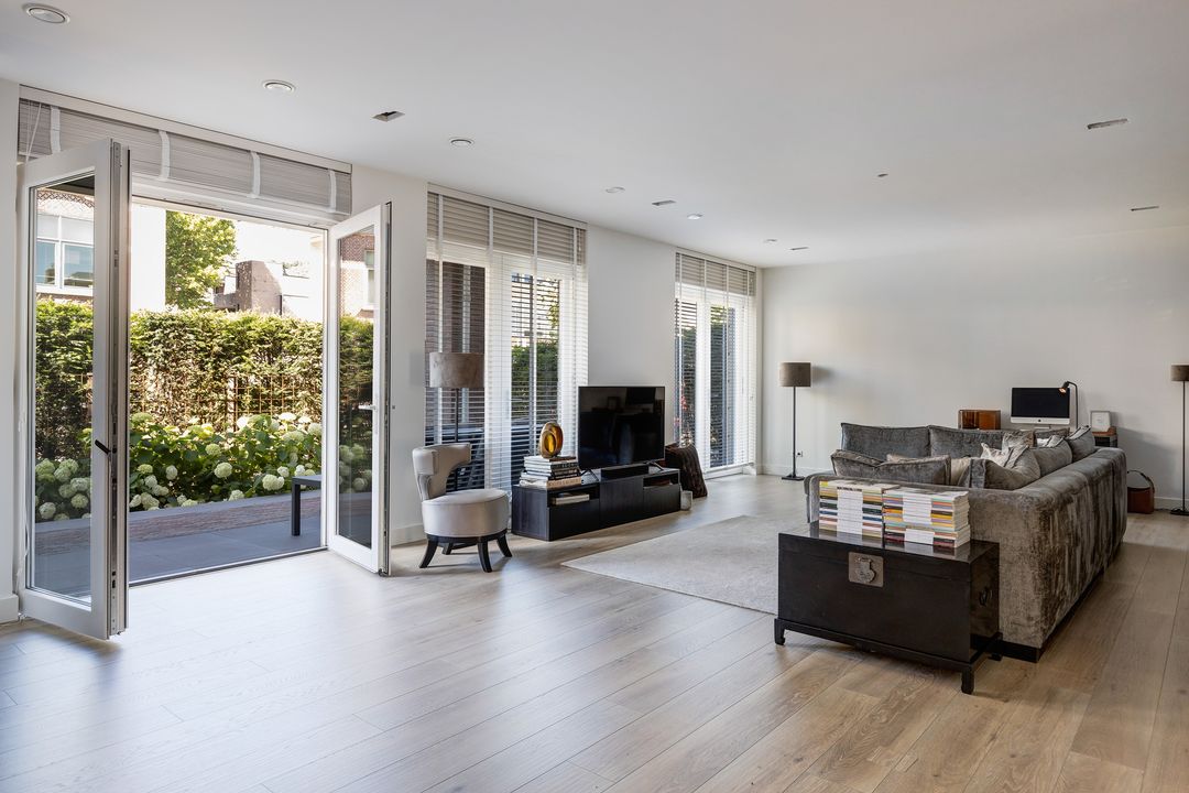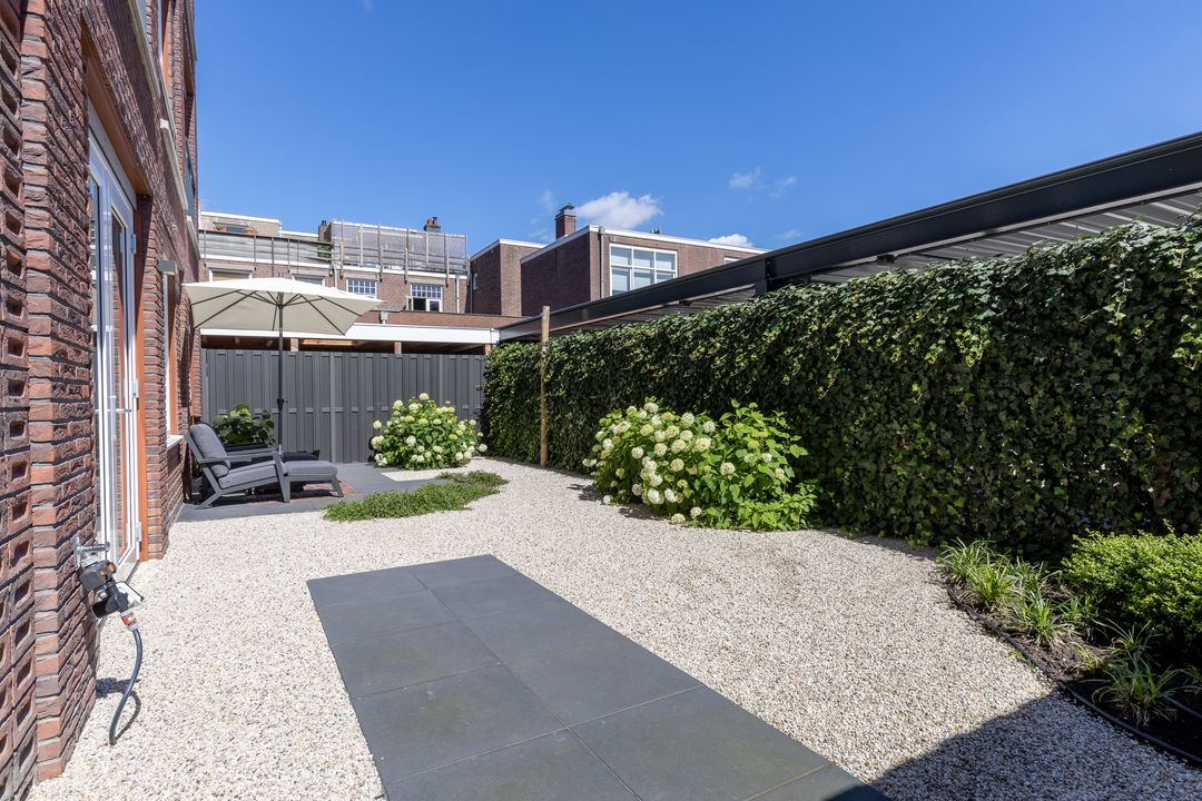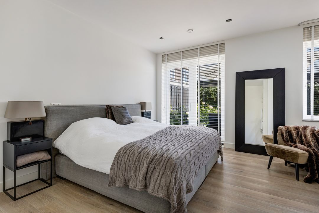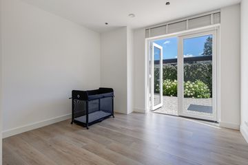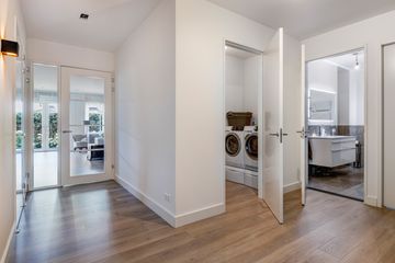 Indeling : entree, hal met garderobe, royale woonkamer 62 m2 met zithoek, een grote open keuken voorzien van Siemens apparatuur, openslaande deuren naar de tuin met terras op het Zuid-Westen. 2e grote hal met wasruimte, apart toilet en toegang naar de badkamer met bad, douche, dubbele wastafel en 2e toilet, extra berging , 2 grote slaapkamers (voorheen 3 slaapkamers, dit is bouwkundig makkelijk in oude staat terug te brengen). Beide slaapkamers komen uit in de achtertuin, met toegang tot een externe inpandige berging met vloerverwarming.