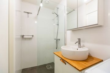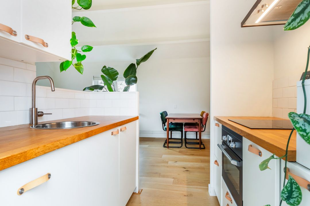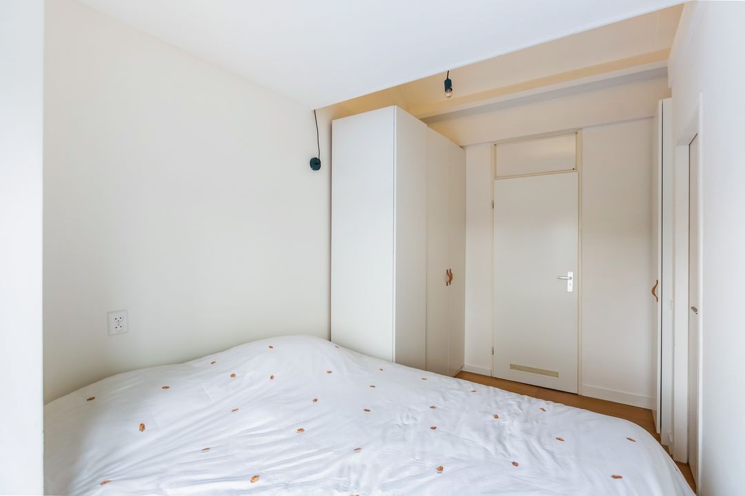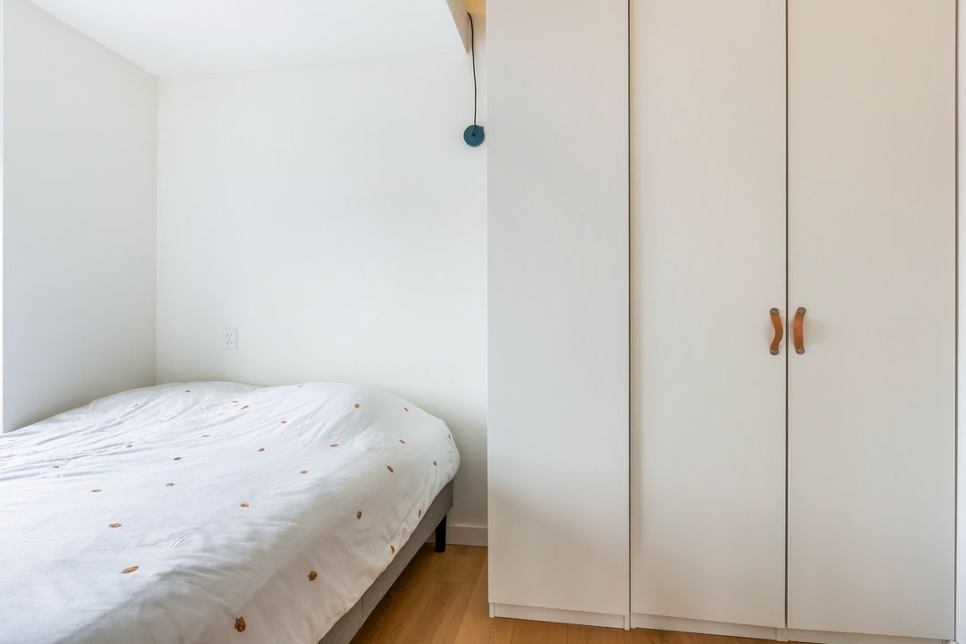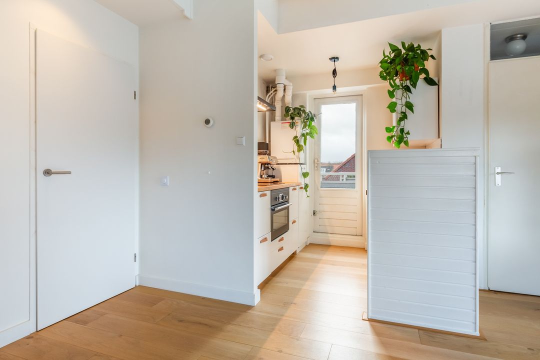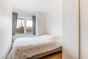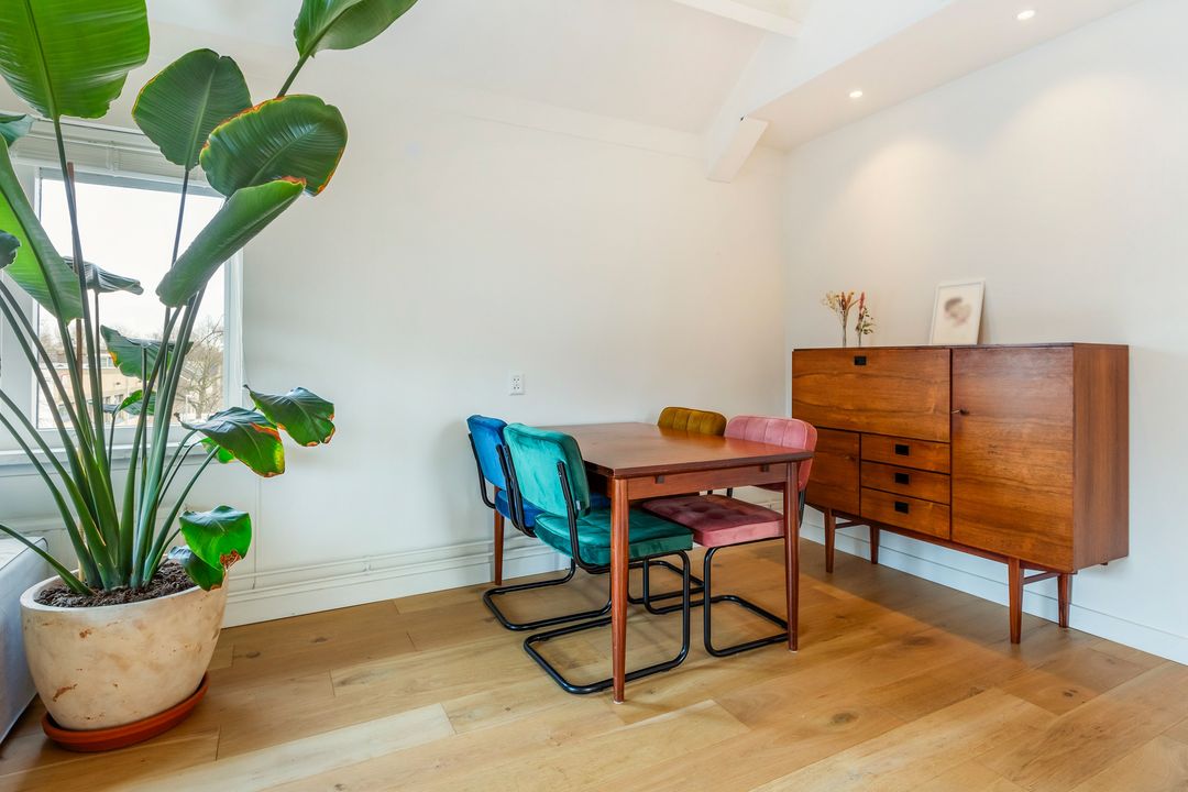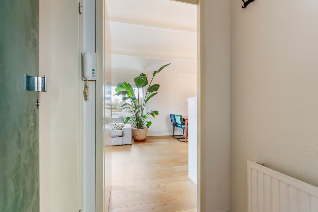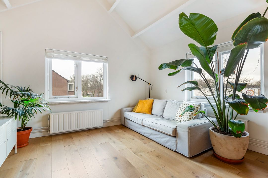 Dit tweekamerappartement heeft opvallend veel licht inval, de woonkamer heeft ramen aan de noord- en oostkant.