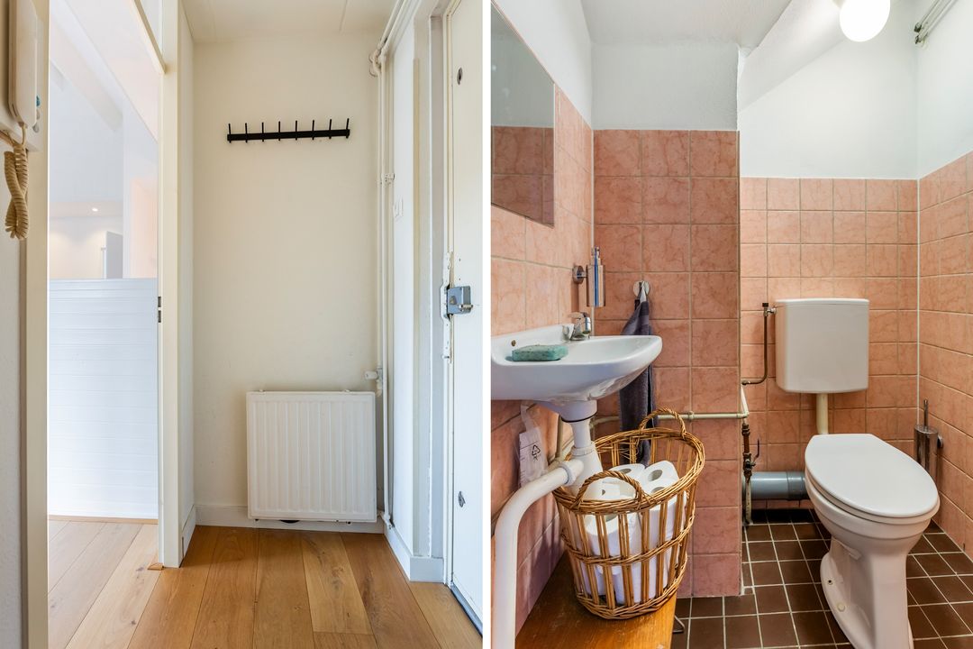 2e Verdieping: Entree, hal met meterkast en toiletruimte. Vervolgens komen we in de lichte woonkamer, wat direct opvalt is de hoogte tot aan de nok. Dit geeft een extra ruimtelijk gevoel.