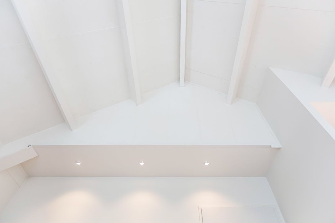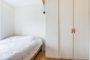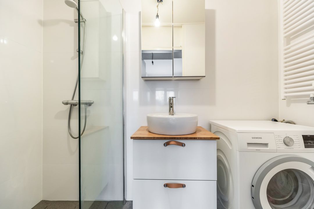 Vanuit de woonkamer kunnen we naar de ruime slaapkamer met toegang tot de badkamer met douche en opstelplaats voor de wasmachine. Ook de slaapkamer heeft een plafond tot aan de nok waar een vloer is gemonteerd zodat er een vide is gecreëerd.