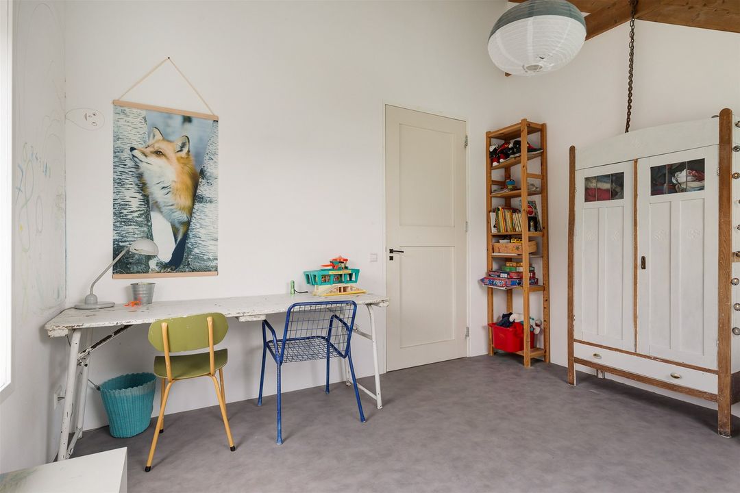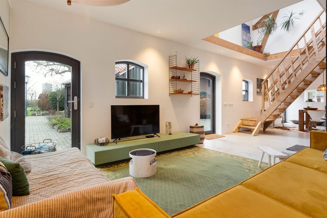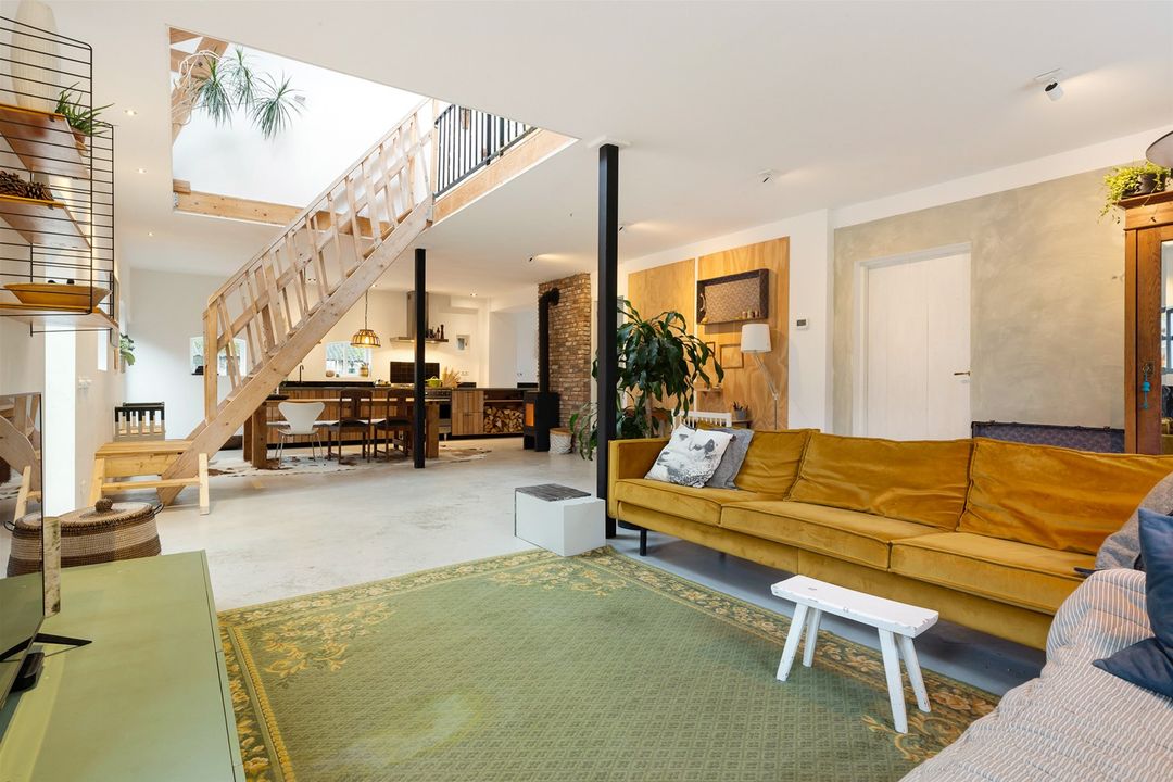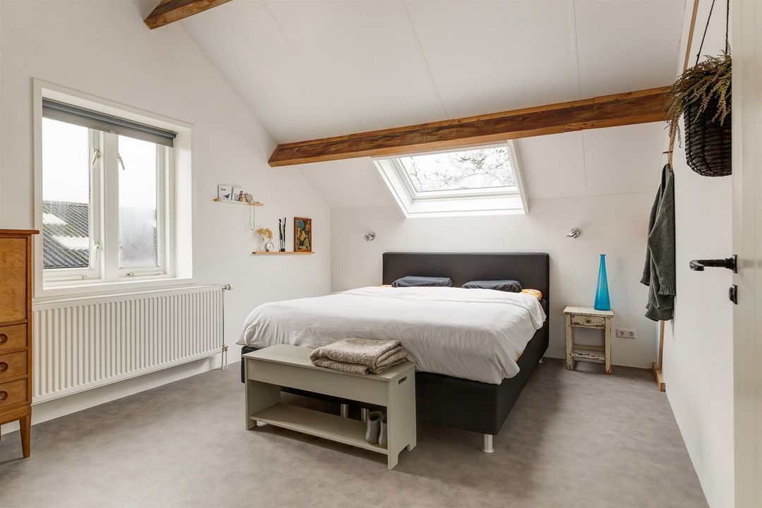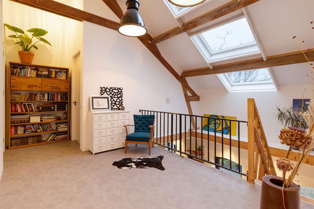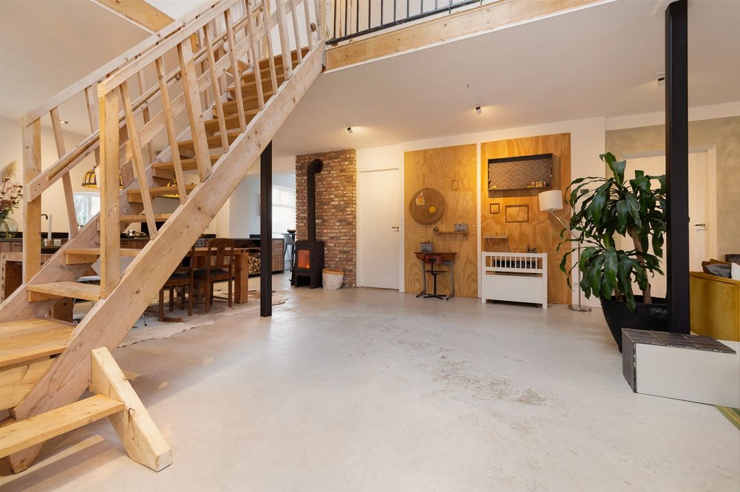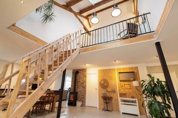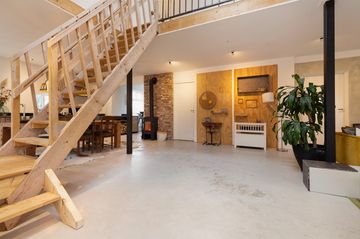 Entree, hal met toegang tot de grote open woonkeuken met groot Smegg kookfornuis met oven en alle moderne inbouwapparatuur. Gezellige houtkachel en aansluitend de woonzitkamer met raampartijen met een doorkijk naar het landelijke gebied. Het open vloerplan met vloerverwarming van maar liefst 110.m2 verbind wonen, koken en ontspannen met elkaar. De entree aan de achterzijde geeft een bijzondere doorkijk naar de vide met een 3 luik aan velux dakramen die voor een speels geheel en veel lichtinval zorgen. Op de 1e etage en op de balkenconstructie tot bovenin de nok. Aan de voorzijde ligt de voormalige opkamer welke in gebruik is als werkkamer. Deze kamer heeft een eigen schouw met kachel/allesbrander.
