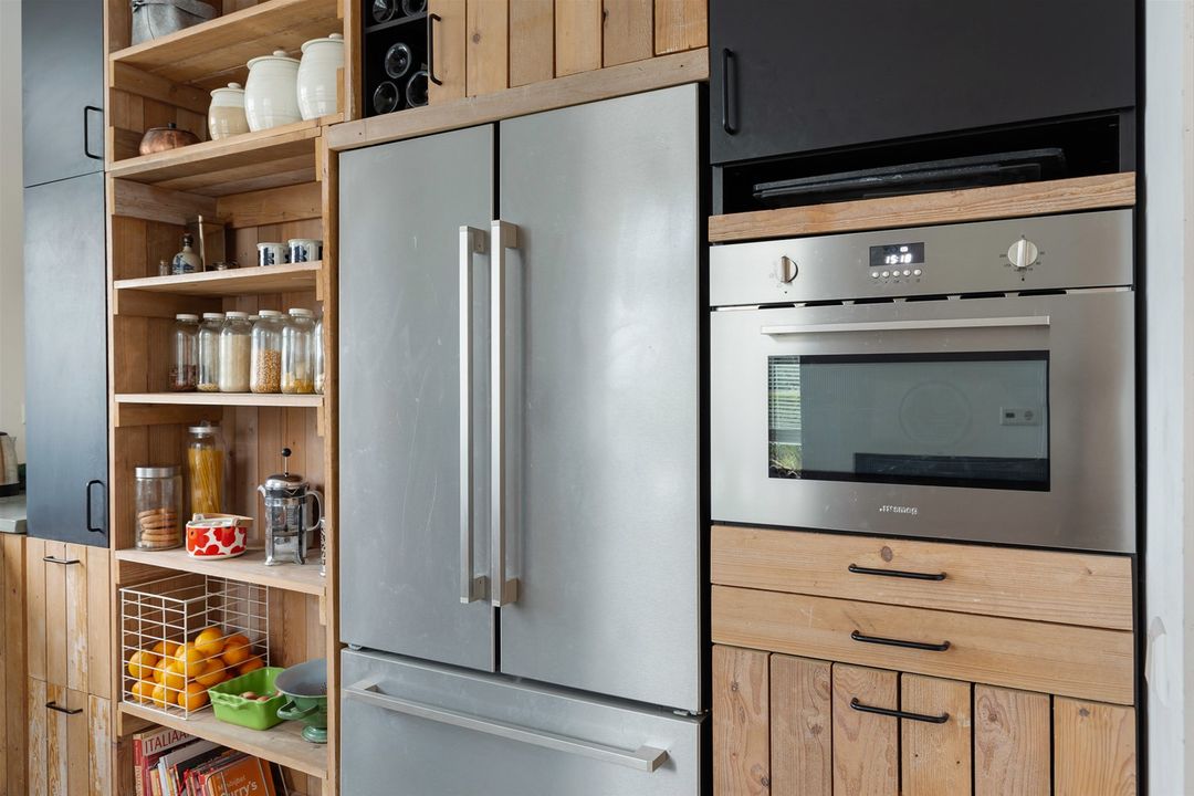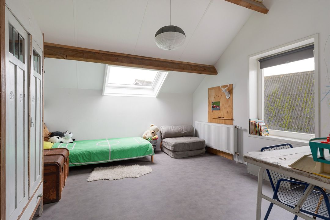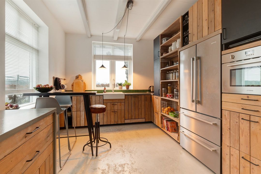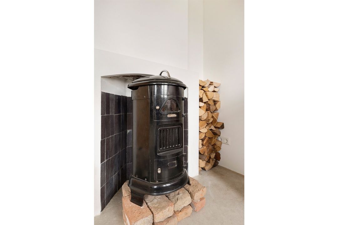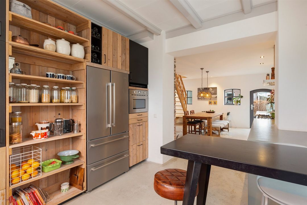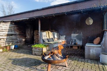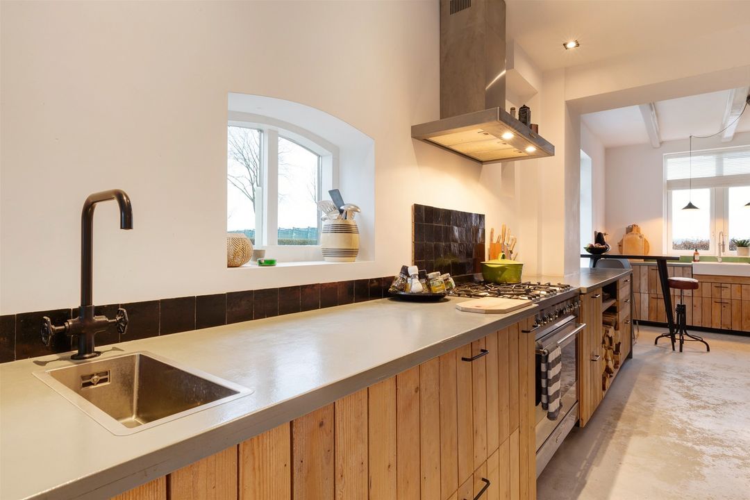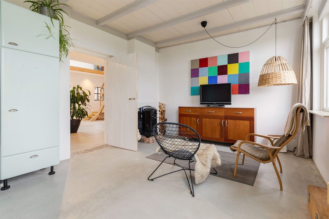 Entree, hal met toegang tot de grote open woonkeuken met groot Smegg kookfornuis met oven en alle moderne inbouwapparatuur. Gezellige houtkachel en aansluitend de woonzitkamer met raampartijen met een doorkijk naar het landelijke gebied. Het open vloerplan met vloerverwarming van maar liefst 110.m2 verbind wonen, koken en ontspannen met elkaar. De entree aan de achterzijde geeft een bijzondere doorkijk naar de vide met een 3 luik aan velux dakramen die voor een speels geheel en veel lichtinval zorgen. Op de 1e etage en op de balkenconstructie tot bovenin de nok. Aan de voorzijde ligt de voormalige opkamer welke in gebruik is als werkkamer. Deze kamer heeft een eigen schouw met kachel/allesbrander.