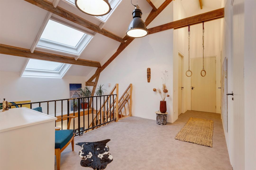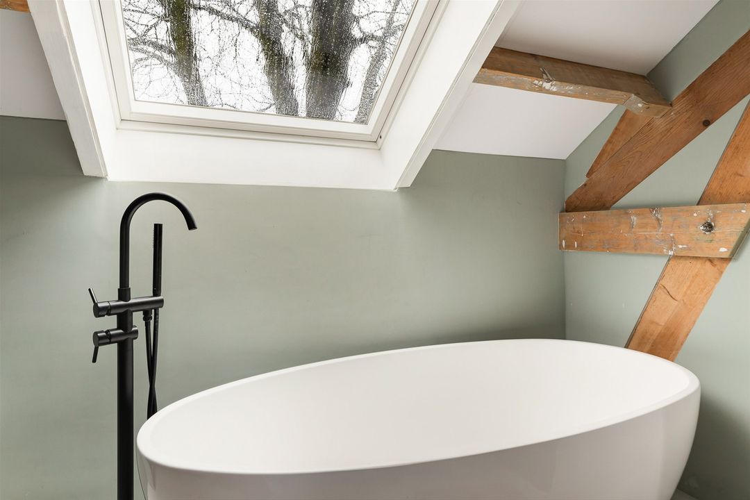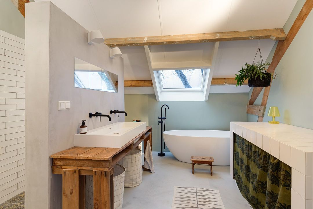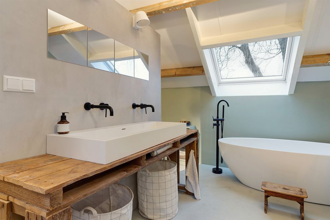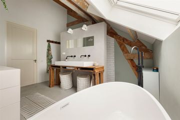 De overloop geeft toegang tot 4 royale slaapkamers met open balkenconstructie zichtbaar tot in de nok en een badkamer en separaat toilet. Ook in de ruime badkamer is de balkenconstructie mooi zichtbaar. Verder is de badkamer uitgevoerd met een vrijstaand design bad, een afgescheiden dubbele inloopdouche, dubbele wastafel en de wanden zijn afgewerkt met een combinatie van tegels en beton cire en ligt er vloerverwarming.
