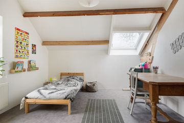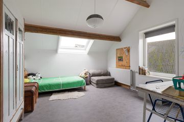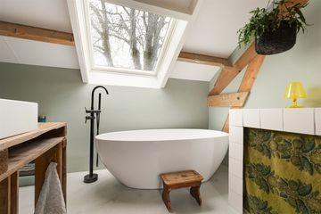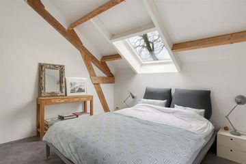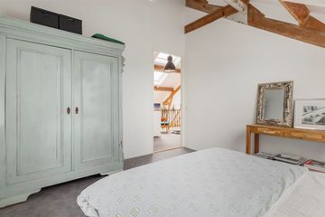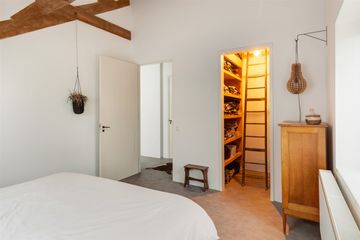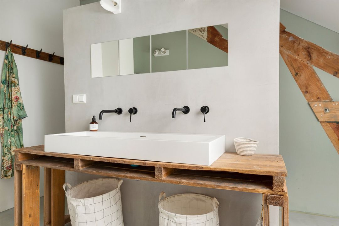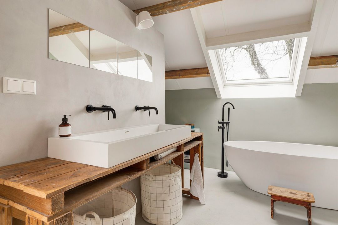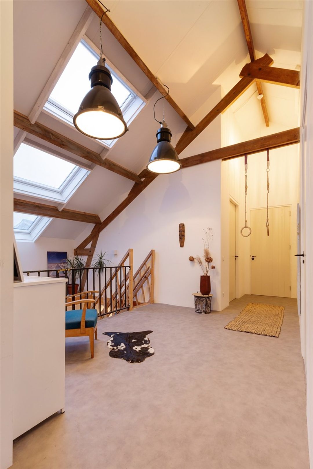 De overloop geeft toegang tot 4 royale slaapkamers met open balkenconstructie zichtbaar tot in de nok en een badkamer en separaat toilet. Ook in de ruime badkamer is de balkenconstructie mooi zichtbaar. Verder is de badkamer uitgevoerd met een vrijstaand design bad, een afgescheiden dubbele inloopdouche, dubbele wastafel en de wanden zijn afgewerkt met een combinatie van tegels en beton cire en ligt er vloerverwarming.