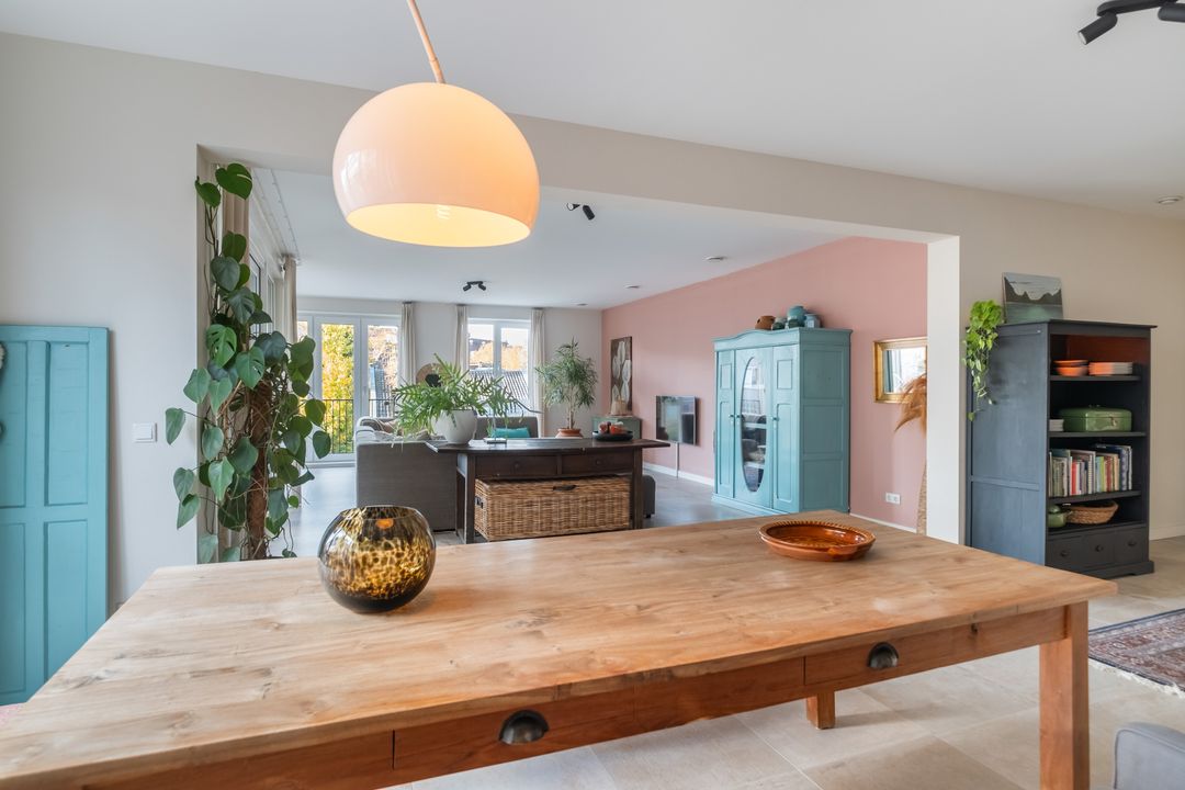 Grenzend aan de keuken is ruimte voor een grote eettafel voor acht personen. Via dubbele openslaande deuren bereikt u het terras, wat het appartement een gevoel van grandeur en licht geeft.