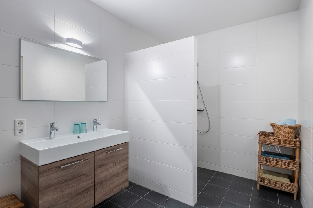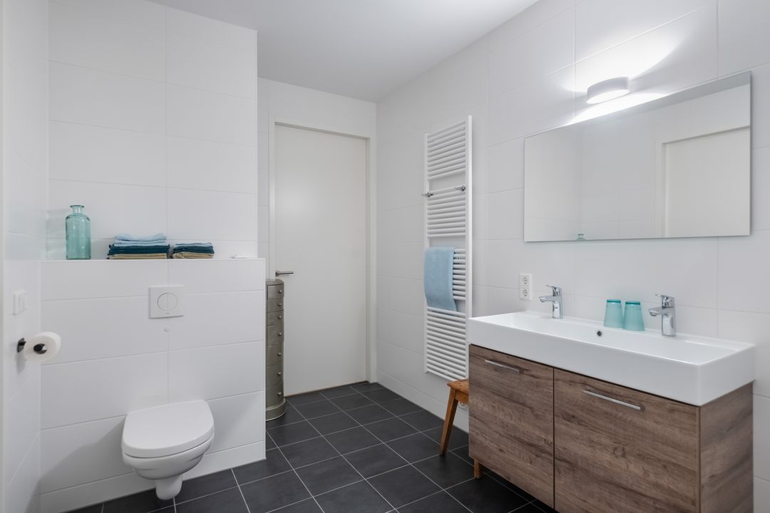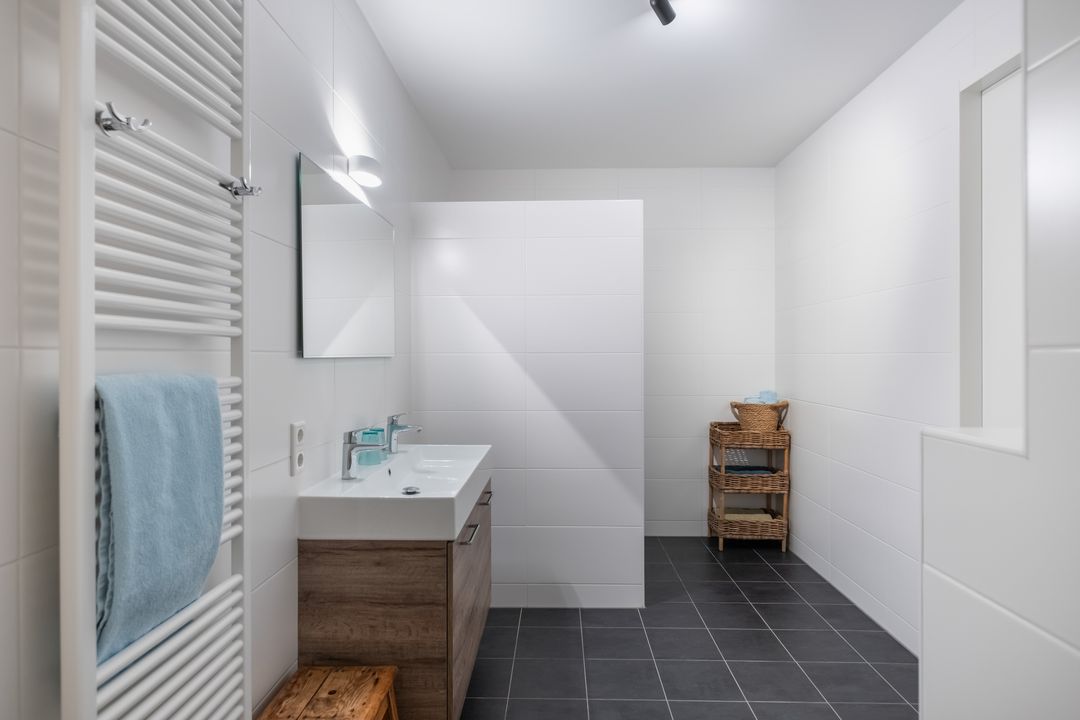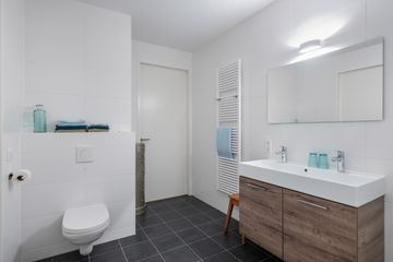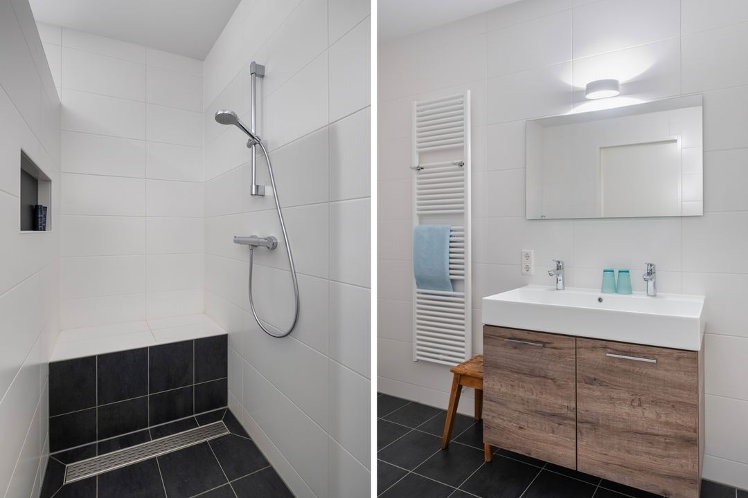 De badkamer is zowel vanuit de hal als vanuit de grootste slaapkamer bereikbaar en voorzien van een douche, extra toilet en wastafel.