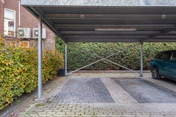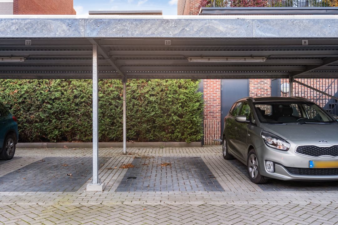 De twee parkeerplaatsen liggen onder een overkapping op het afgesloten binnenterrein.