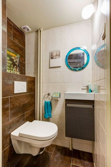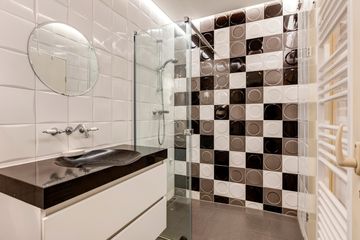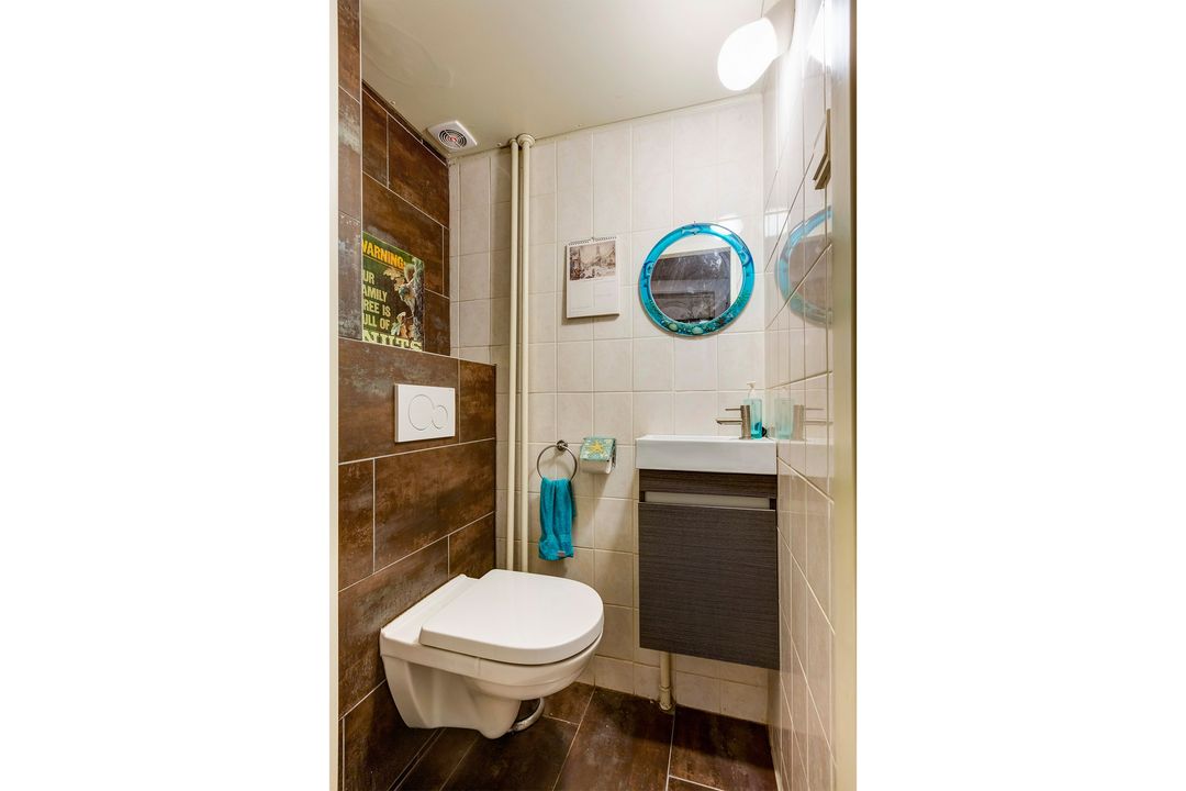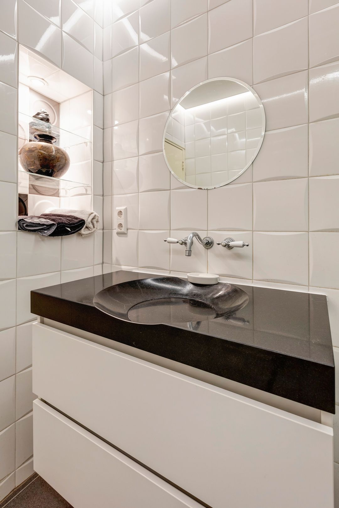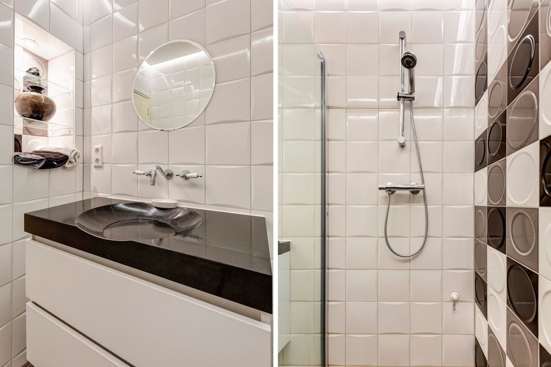 Als u de badkamer betreedt merkt u gelijk dat er programmeerbare elektrische vloerverwarming aanwezig is. Tevens hangt er een elektrische designradiator met thermostaat. Door de glazen verschuifbare douchewand creëert u een brede rolstoelvriendelijke doorgang. Er bevindt zich ook een ruime nis waarin een waterboiler (in eigendom) met een capaciteit van 80 liter hangt, direct bij de douche. Ook is er ruimte voor een wasmachine en een droger.