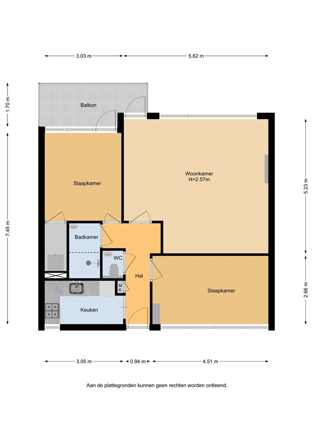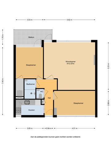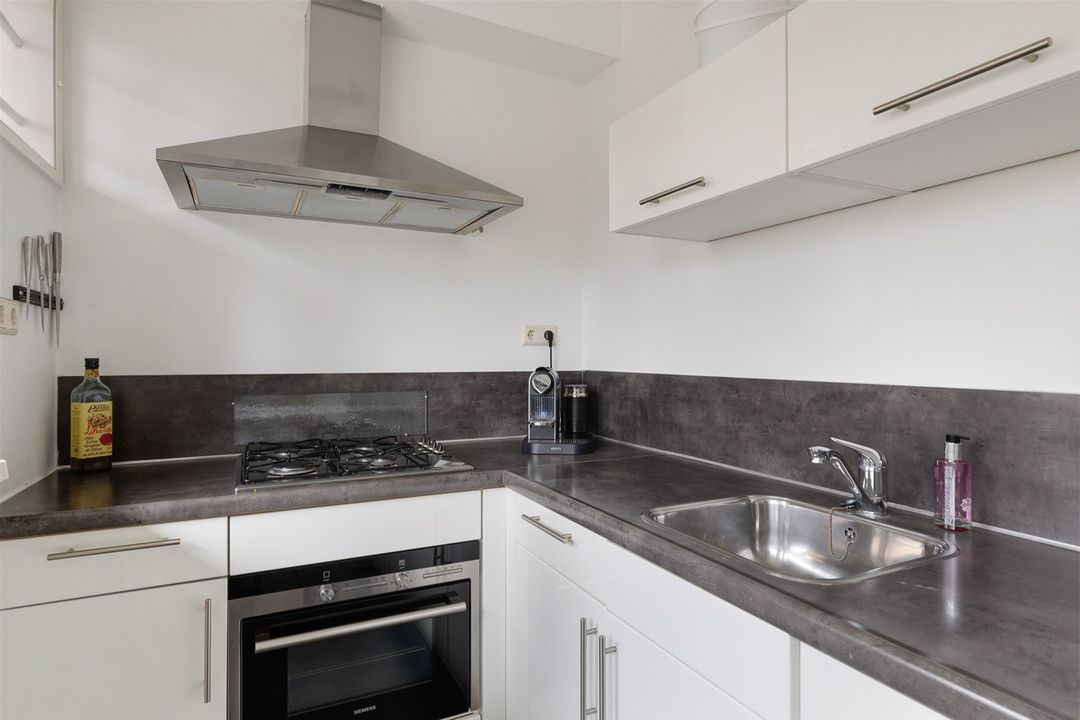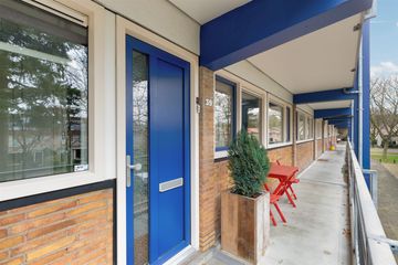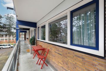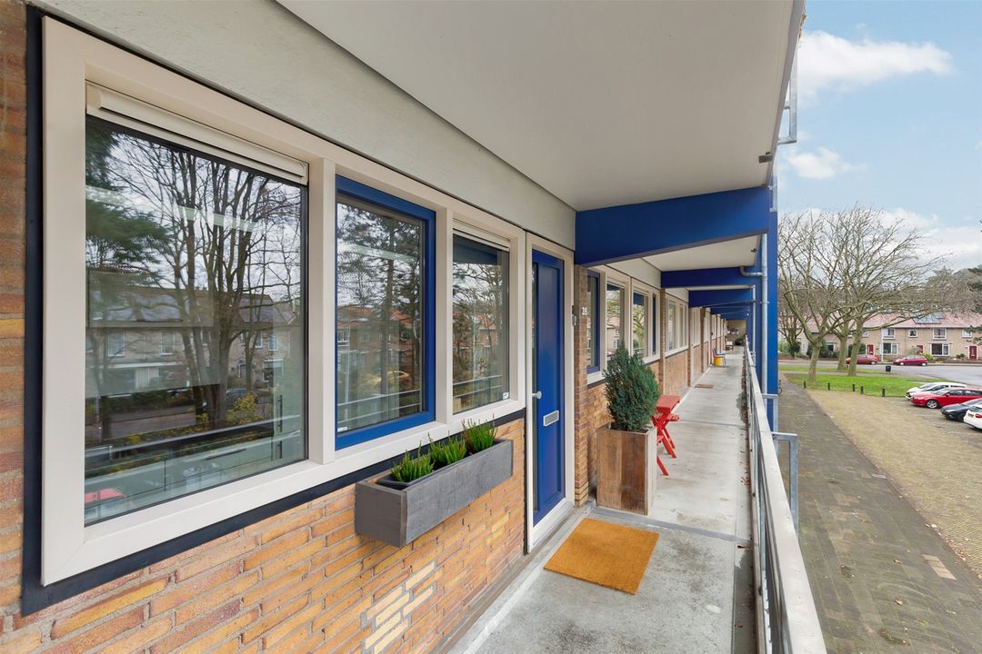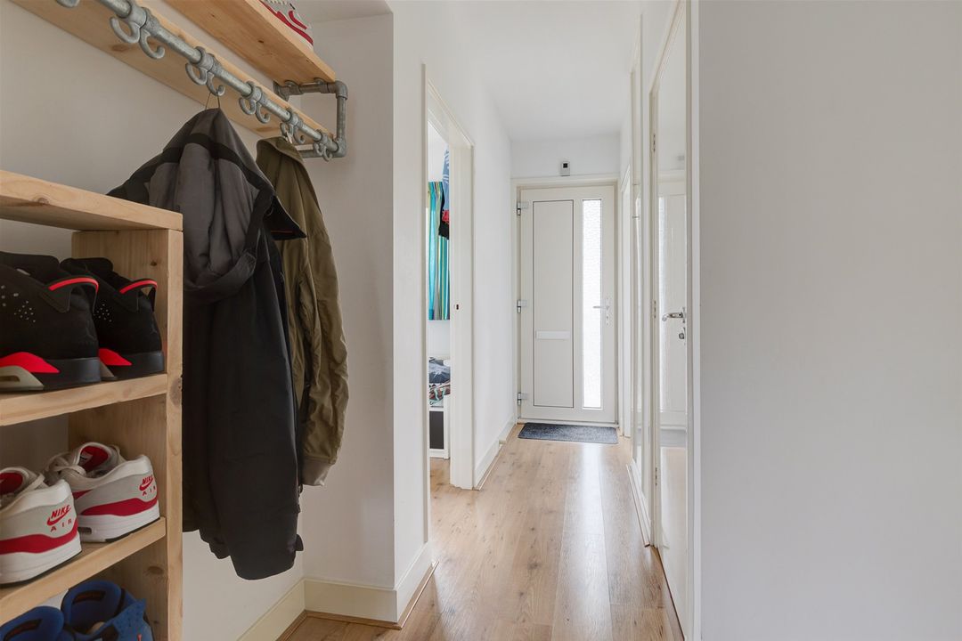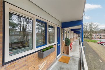 Entree, hal, moderne keuken met diverse inbouwapparatuur aan de galerijkant. De lichte grote woonkamer van 30 m2 (voorheen aparte woonkamer met slaapkamer ernaast) geeft toegang tot het balkon en is aan de achterzijde van het gebouw gelegen met vrij uitzicht over het groenplantsoen. Twee slaapkamers waarvan de grote slaapkamer aan de achterzijde tevens toegang heeft tot het balkon. De kleinere slaapkamer is aan de voorzijde gelegen. Vanuit de hal is het separate toilet alsmede de moderne badkamer te bereiken, voorzien van een douche en een wastafelmeubel. De CV-ketel en de witgoedopstelling bevinden zich in de keuken.