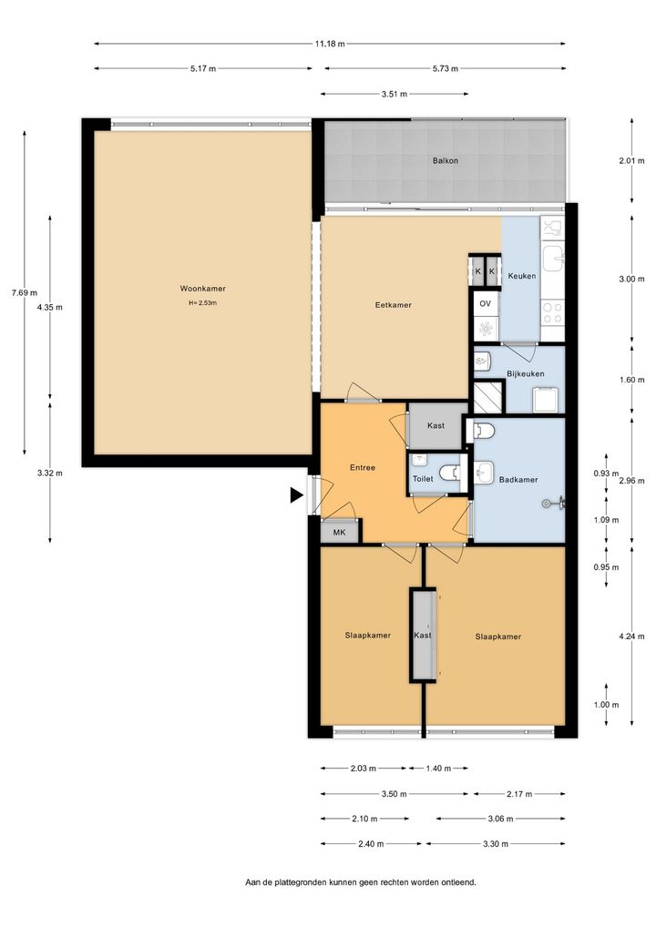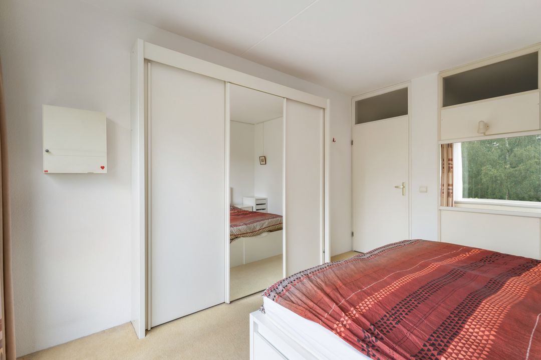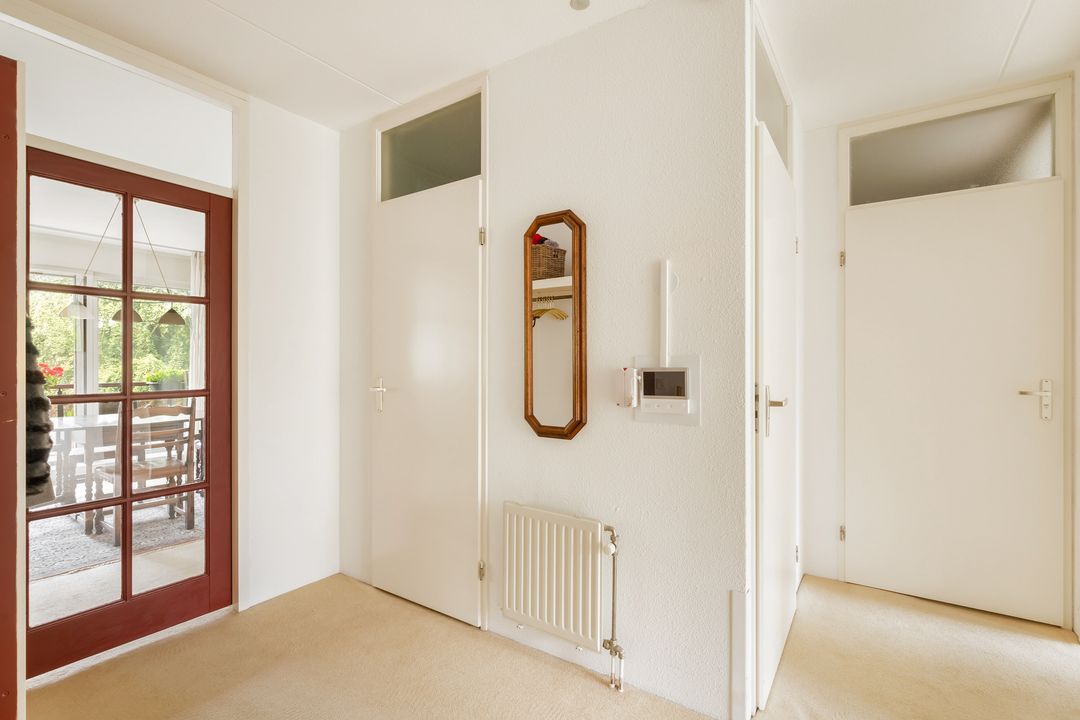 Entree, ruime hal met meterkast, inpandige berging, garderobe en toegang tot alle vertrekken. De zeer ruime woonkamer beschikt over een schuifpui naar het ruime balkon met vrij en weids uitzicht over het groen. De half open Miele-keuken bevindt zich aan de rechterzijde en is voorzien van Miele-inbouwapparatuur, te weten een inductiekookplaat met oven en afzuigkap, spoelbak, magnetron, vaatwasser en een koelkast. Vanuit de keuken is de bijkeuken bereikbaar met de aansluitingen voor de was-apparatuur, C.V.-ketel en en mechanische ventilatie-unit. Vanuit de hal is het separate toilet te bereiken. De twee slaapkamers hebben fraai uitzicht op de groene omgeving. Vanuit de grootste slaapkamer en vanuit de hal is de badkamer bereikbaar. De ruime badkamer beschikt over een douche, tweede hangend toilet en een wastafel.