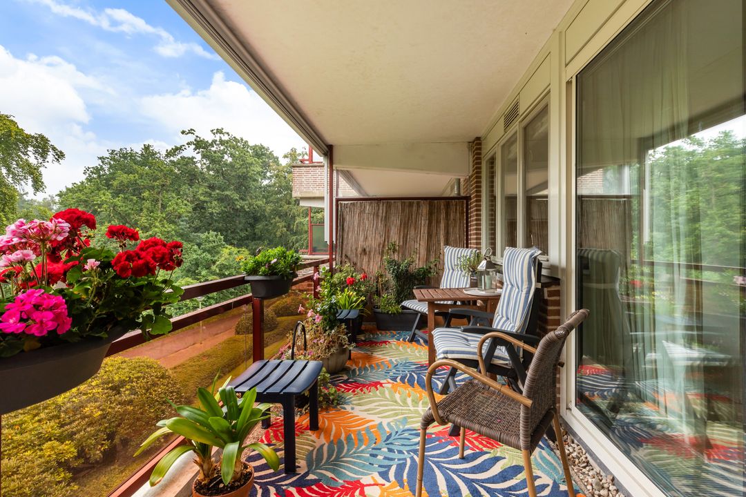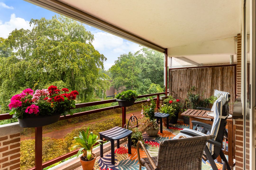 Het balkon kunt u bereiken door middel van een schuifpui, vanuit de woonkamer. Het zonnige balkon is gesitueerd op het westen en biedt vrij uitzicht in het groen.