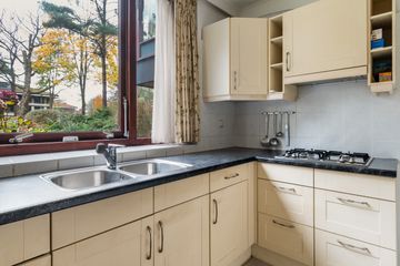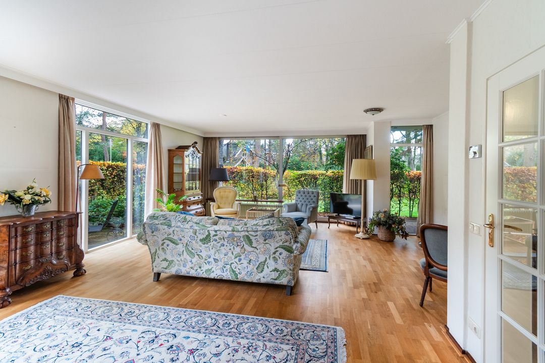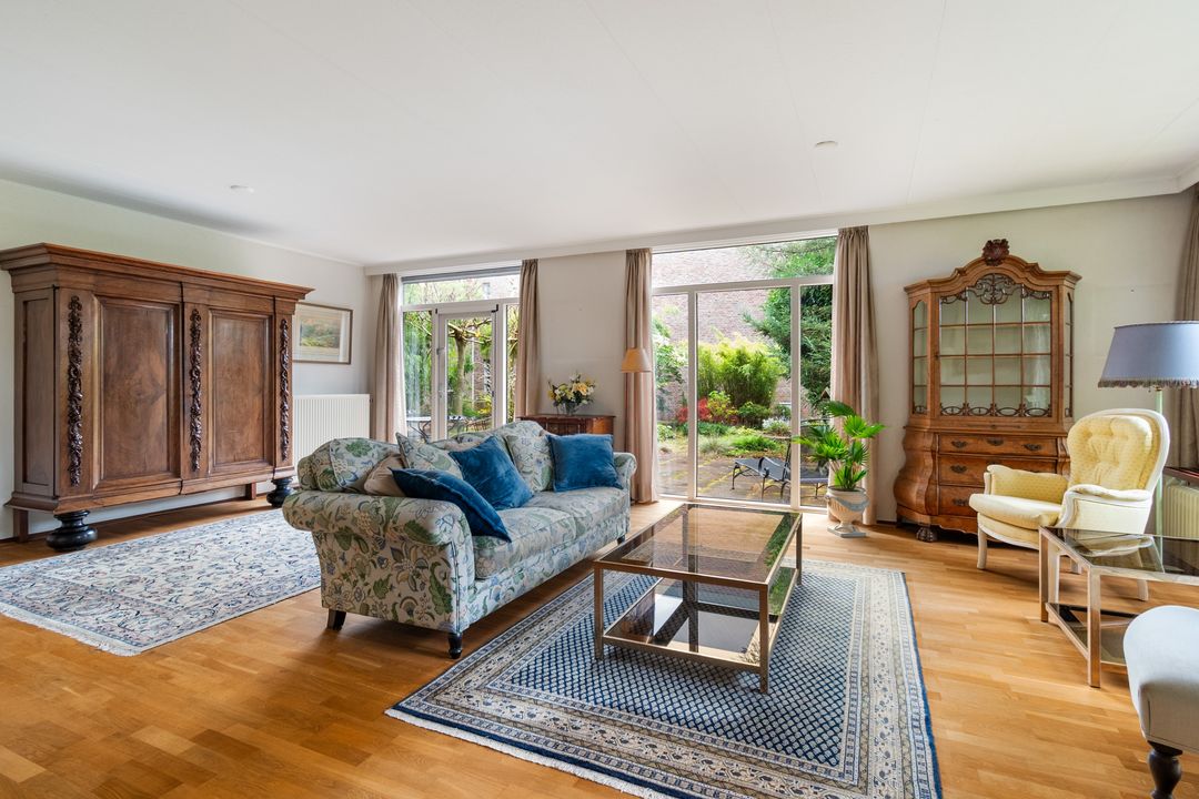De opvallend lichte woonkamer, dankzij de grote raampartijen, is gesitueerd op het zuidwesten en grenst direct aan de privé tuin. Deze tuin van circa 140 m² biedt veel privacy door de hoge beplanting.
