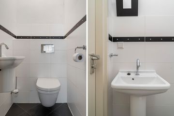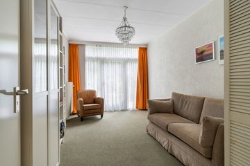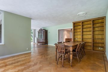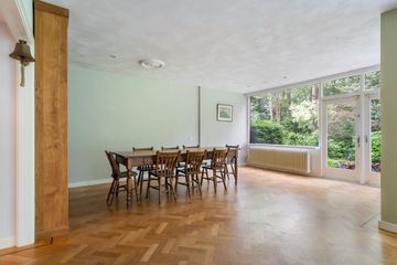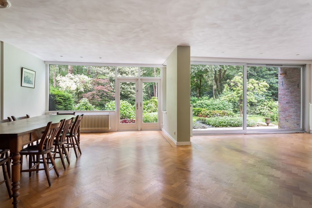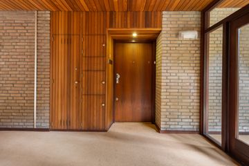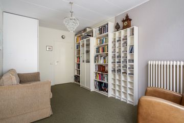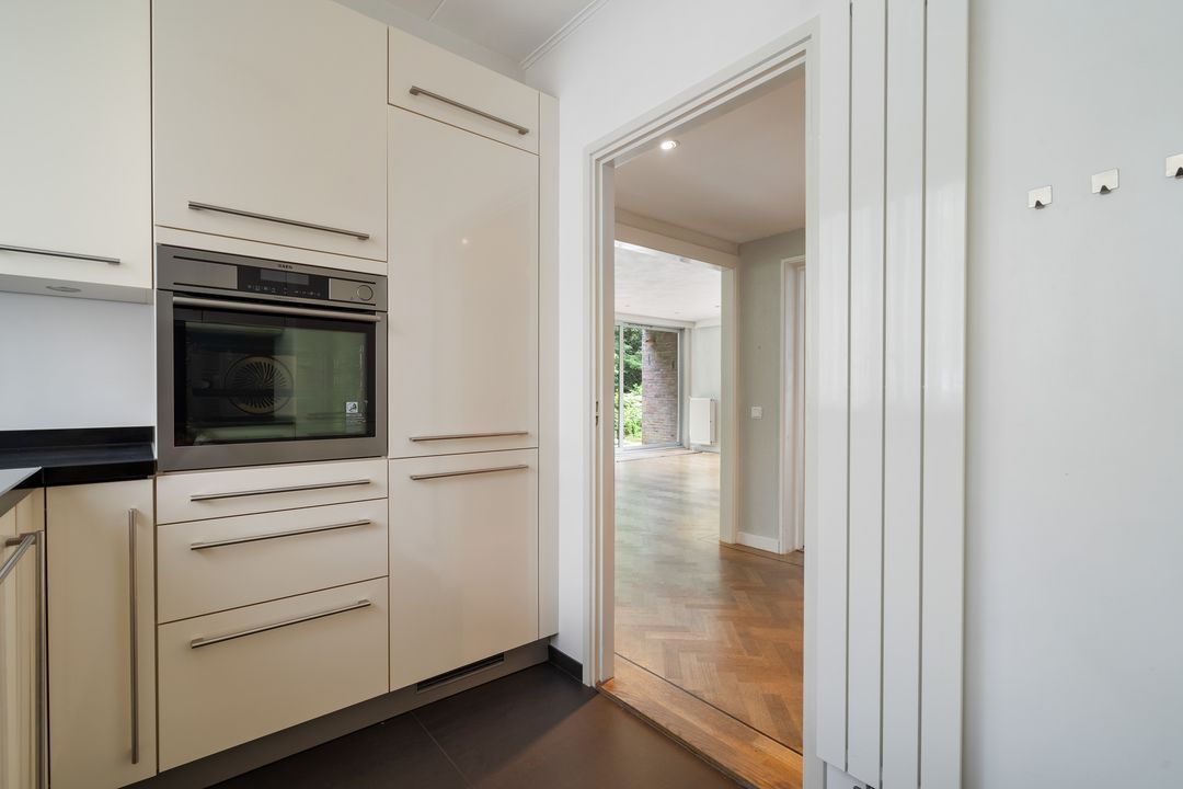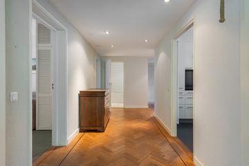– De entree/hal, woonkamer en eetkamer zijn voorzien van een visgraat massief eiken vloer met zwarte bies. De eikenhouten op maat gemaakte boekenkast maakt het geheel compleet.