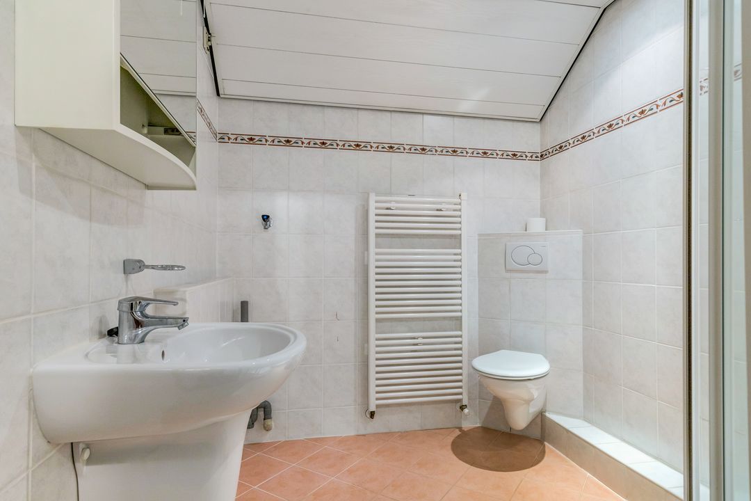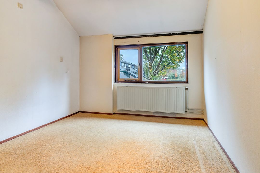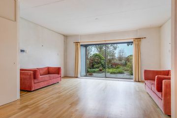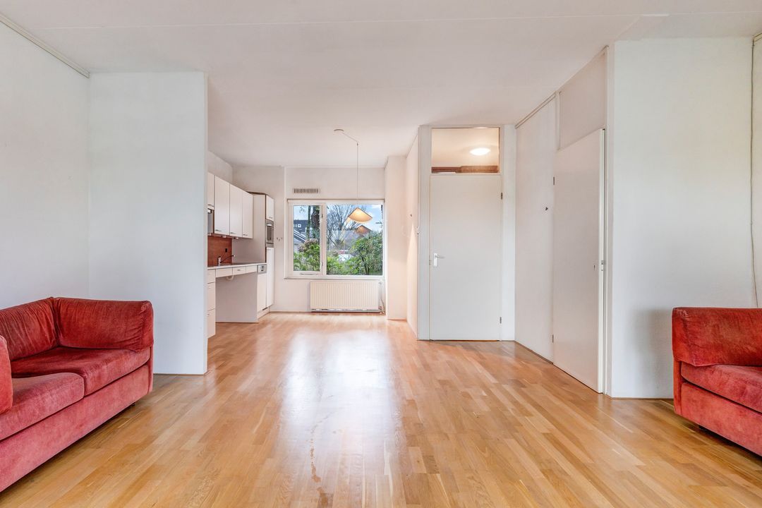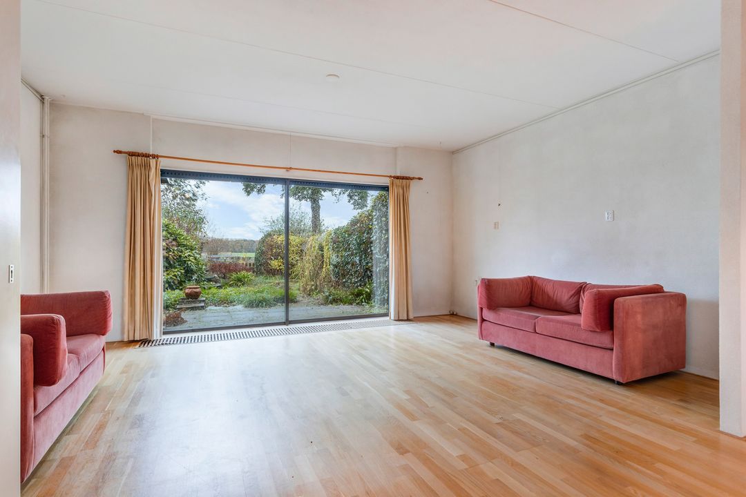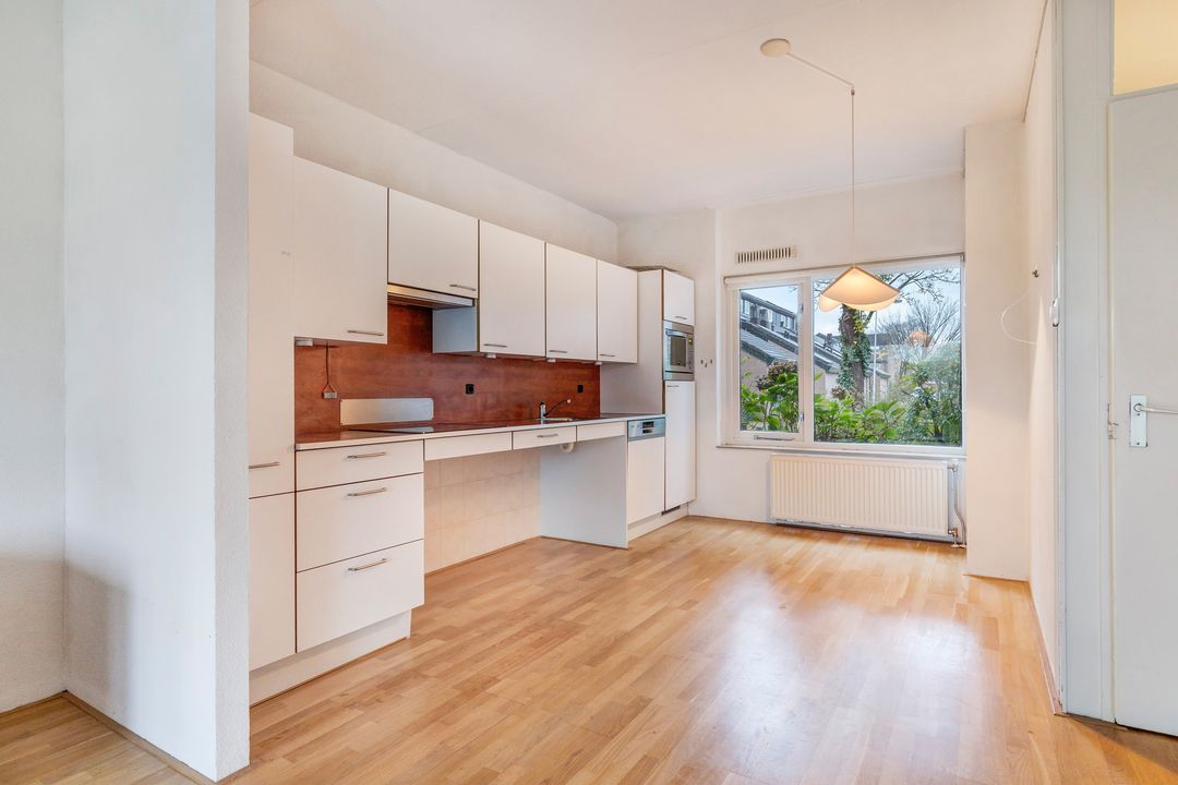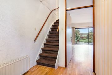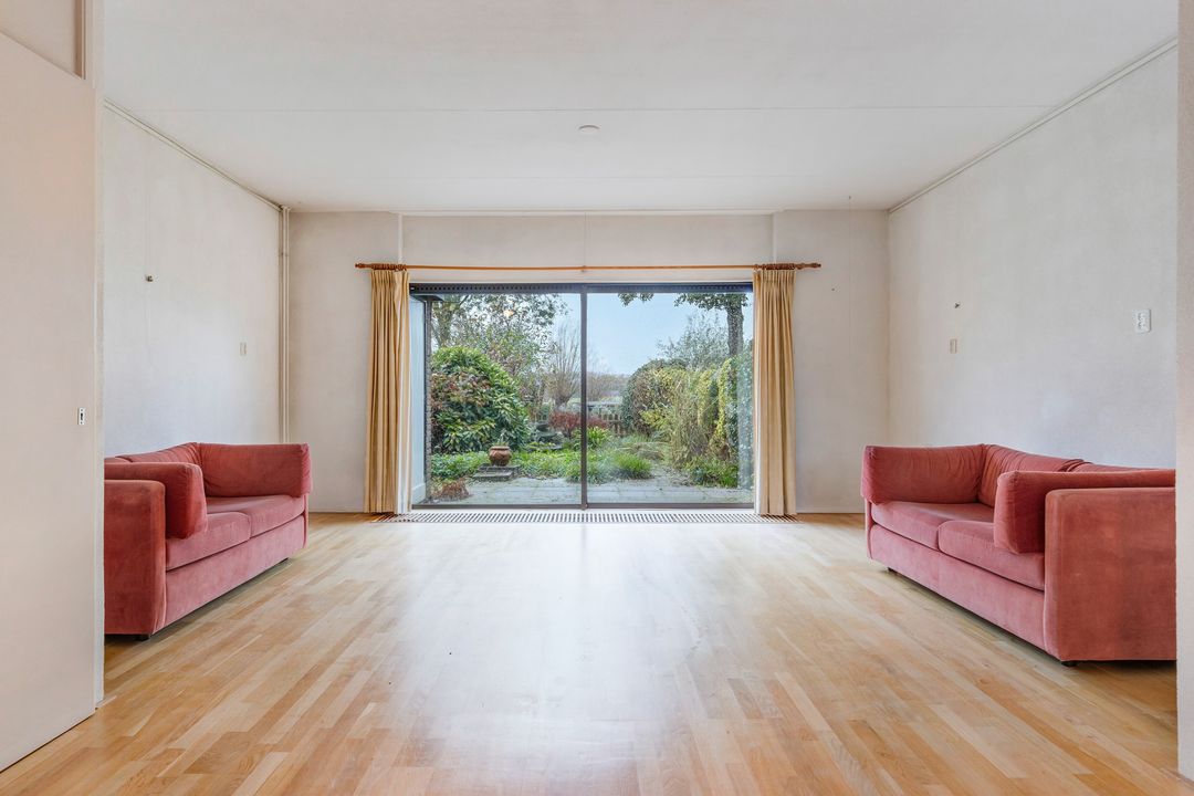 Een schuifpui geeft toegang tot de zonnige achtertuin. Vanuit de woonkamer kijk je prachtig uit over de weilanden richting Bunnik. Aan de voorzijde ligt de open aangepaste keuken. De woonkamer is voorzien van een laminaatvloer.