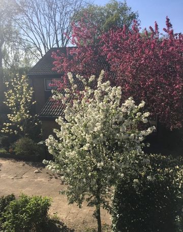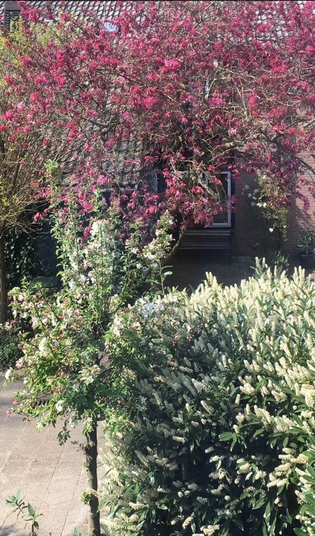 In de lente de bloesem van het malusboompje in de voortuin”.