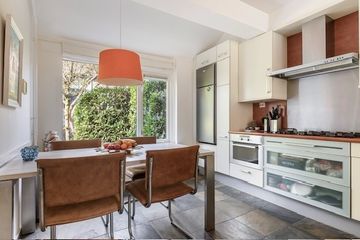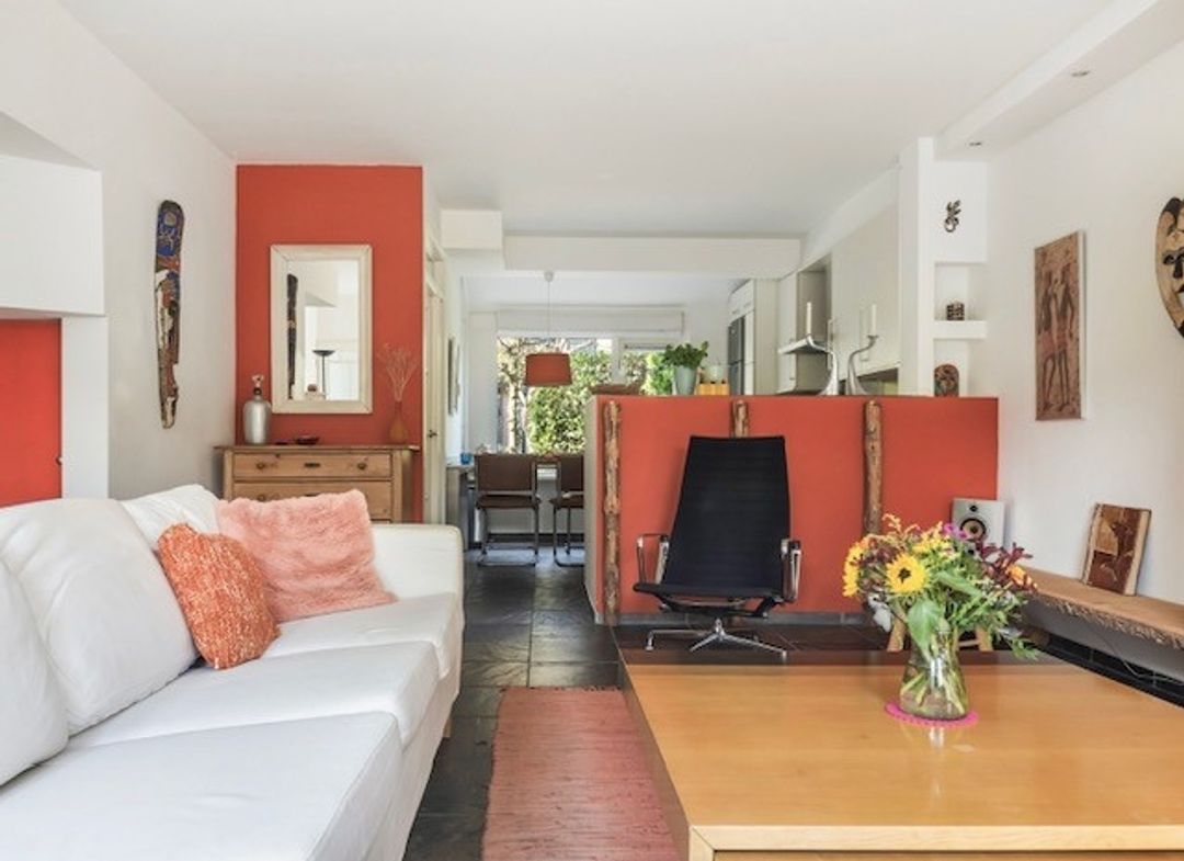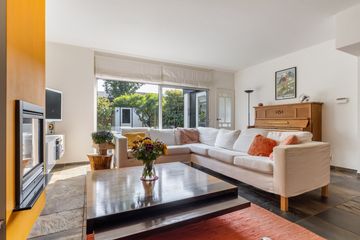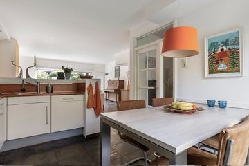 Dankzij het schiereiland in de keuken is er een open verbinding met de woonkamer, wel zo gezellig als je staat te koken, en waarvandaan je zicht hebt op zowel de voor-als achtertuin.