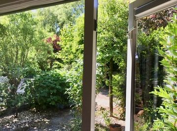 In de keuken is er veel privacy door de volle laurierhaag maar kijk je door het grote raam met brede vensterbank schuin uit over natuur en zie je het riviertje door de bomen heen. Af en toe kun je hier een ijsvogel spotten!