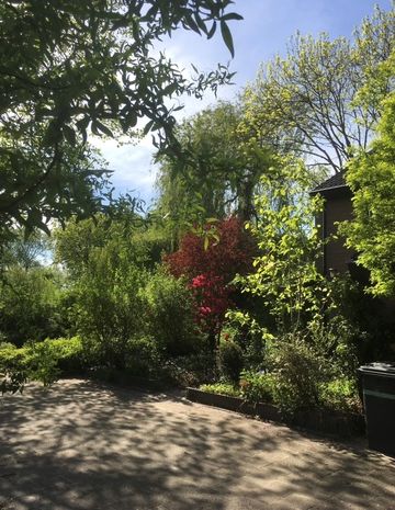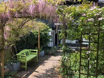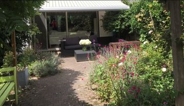 Die is goed ingedeeld en geeft door de beplanting en pergola het gevoel omringd te zijn door groen, in de zomer vol bloemen, bezocht door bijen en vlinders. Hier is de hele dag zon maar zijn er ook plekjes waar je de schaduw kunt opzoeken.