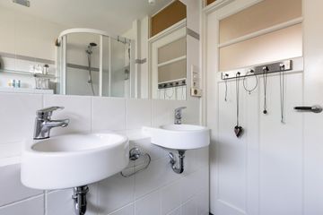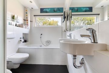 Aan de voorkant bevindt zich de lichte badkamer met elektrische vloerverwarming, voorzien van een ruim ligbad, een aparte douche, zwevend toilet, handdoekradiator en twee kleine wastafels.