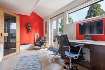 Aan de achterzijde is een zeer ruime slaapkamer (voorheen 2 slaapkamers) met frans balkon. Deze kamer wordt nu gebruikt als werk/sauna/sport- en relax ruimte.