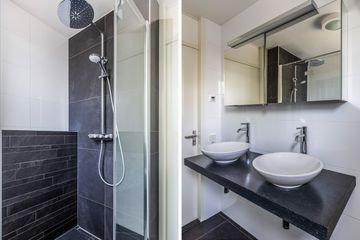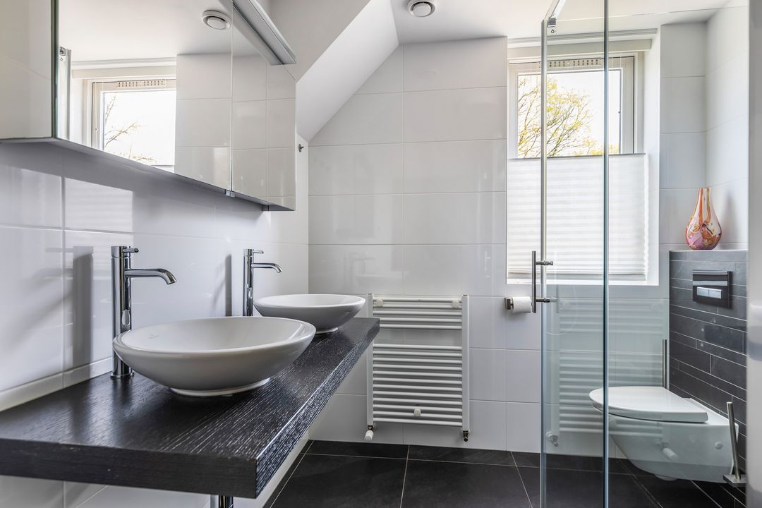 Overloop, drie, in grootte variërende slaapkamers en de moderne badkamer (2015) met toilet, douche en dubbele wastafel.