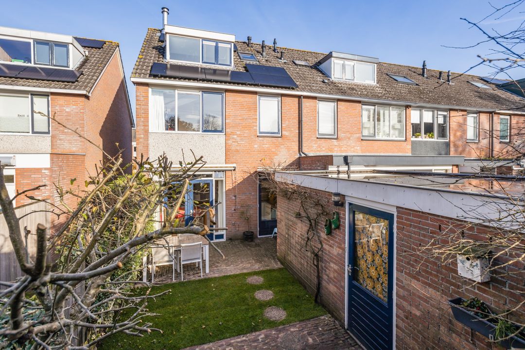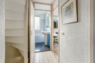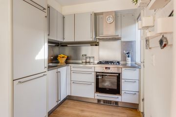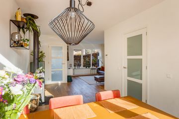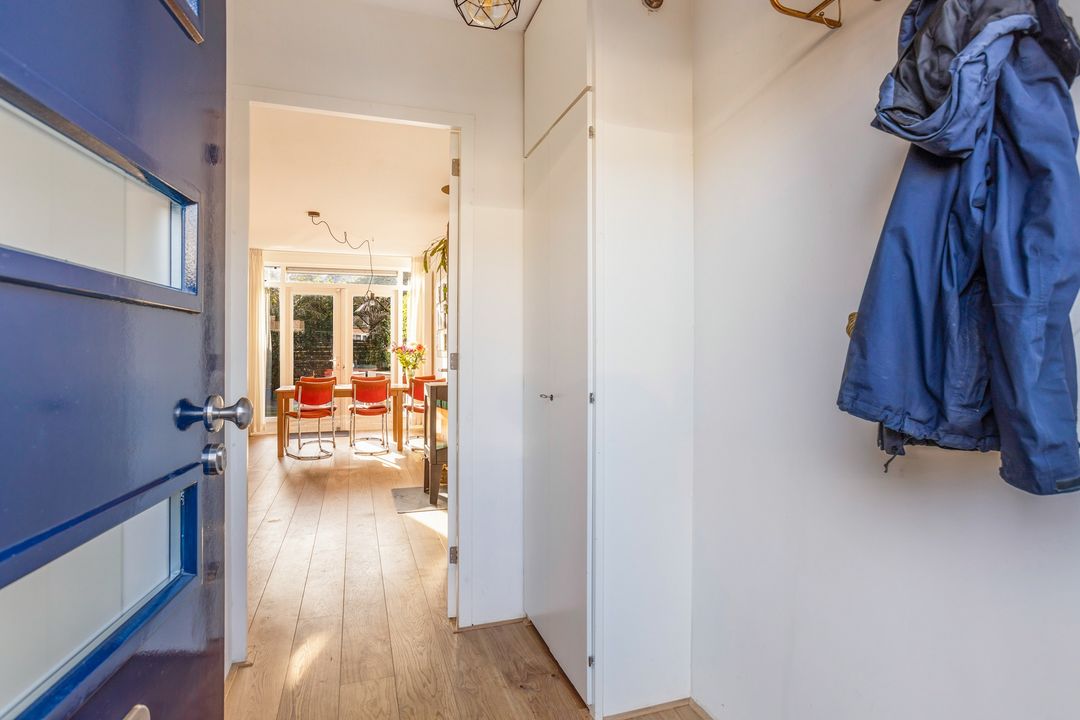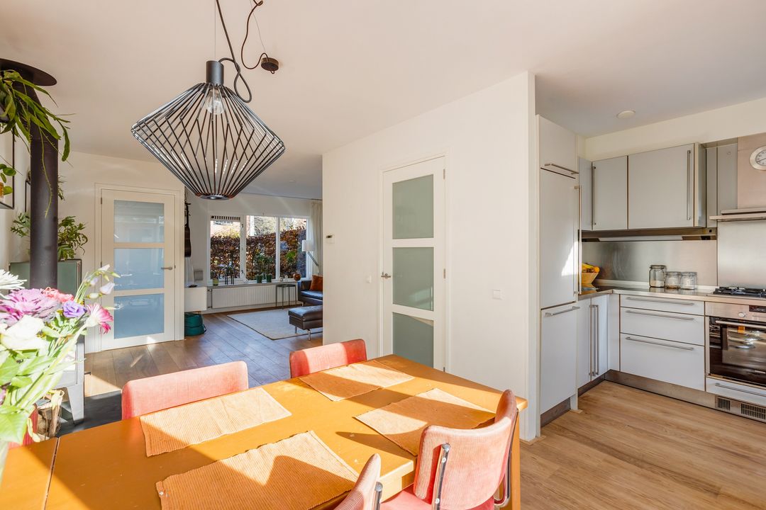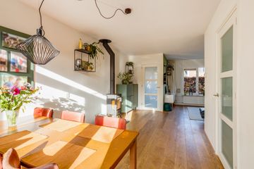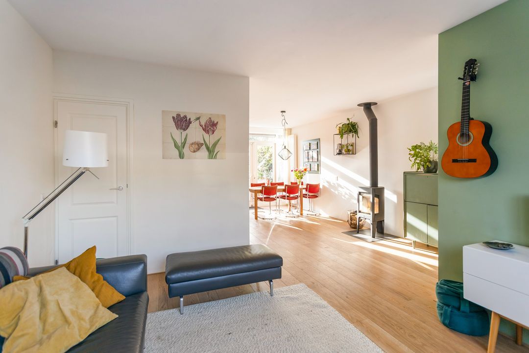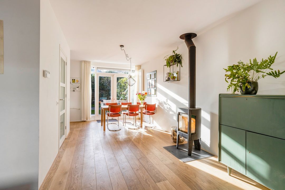 Entree, halletje met meterkast. Toegang tot de woonkamer met mooie nette eiken houten vloer, woonkamergedeelte aan de voorzijde van de woning met gezellige houtkachel en eethoek, vanuit de woonkamer is door middel van openslaande deuren de achtertuin te bereiken. De keuken van het merk Bulthaup heeft een L-vormige hoekopstelling en is aan de achterzijde van de woning gesitueerd met een deur naar de tuin. De keuken is voorzien van een RVS aanrechtblad, ingebouwde oven, gaskookplaat, afzuigkap, koelkast (uit 2020), vaatwasmachine (Miele uit 2020, extra stil) en een aansluiting voor een eventueel toekomstige inductiekookplaat.