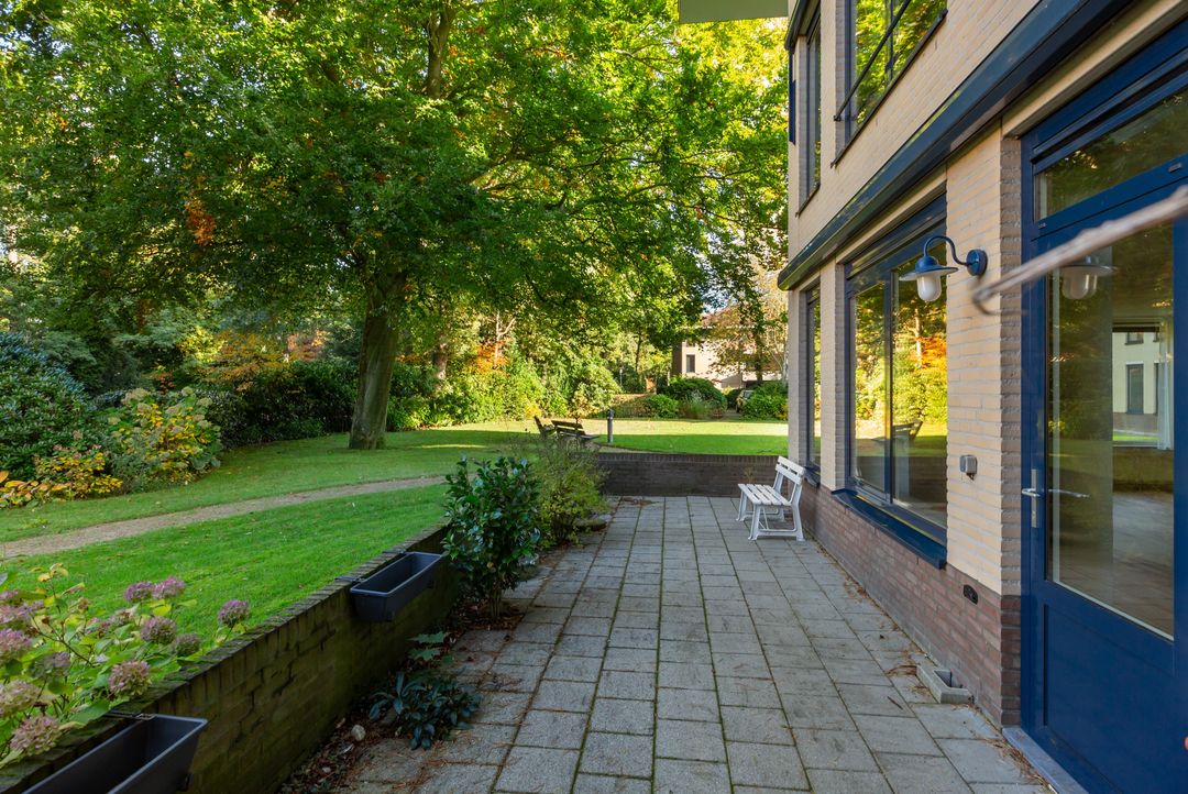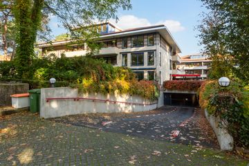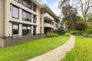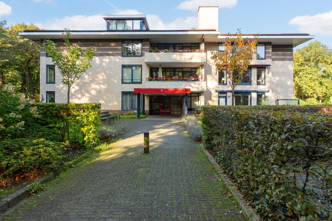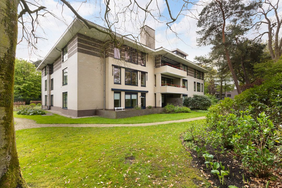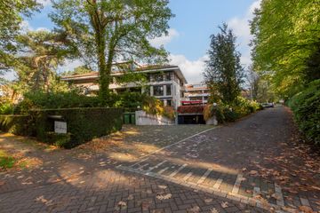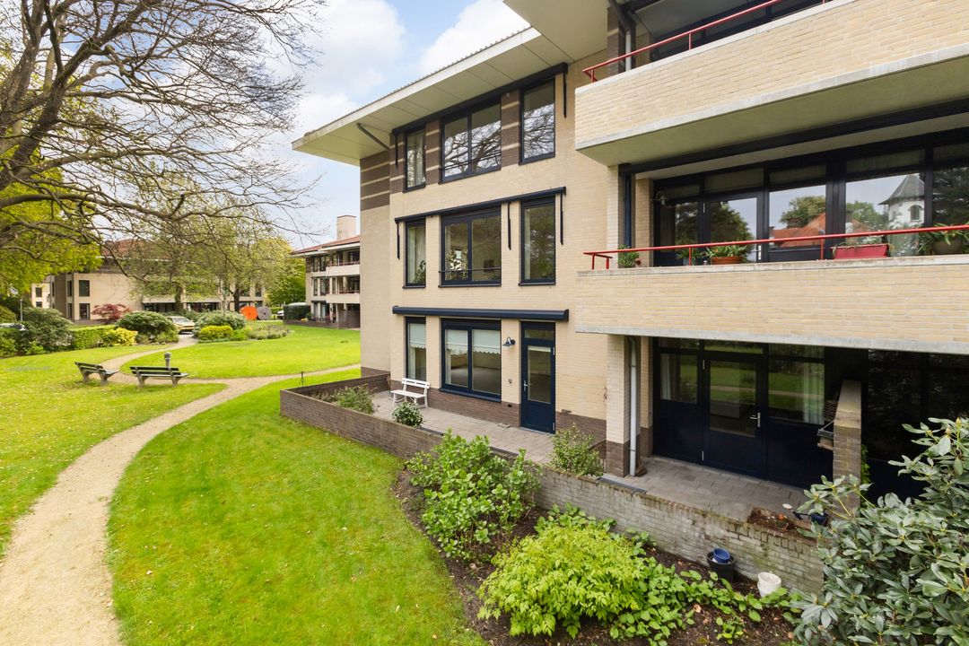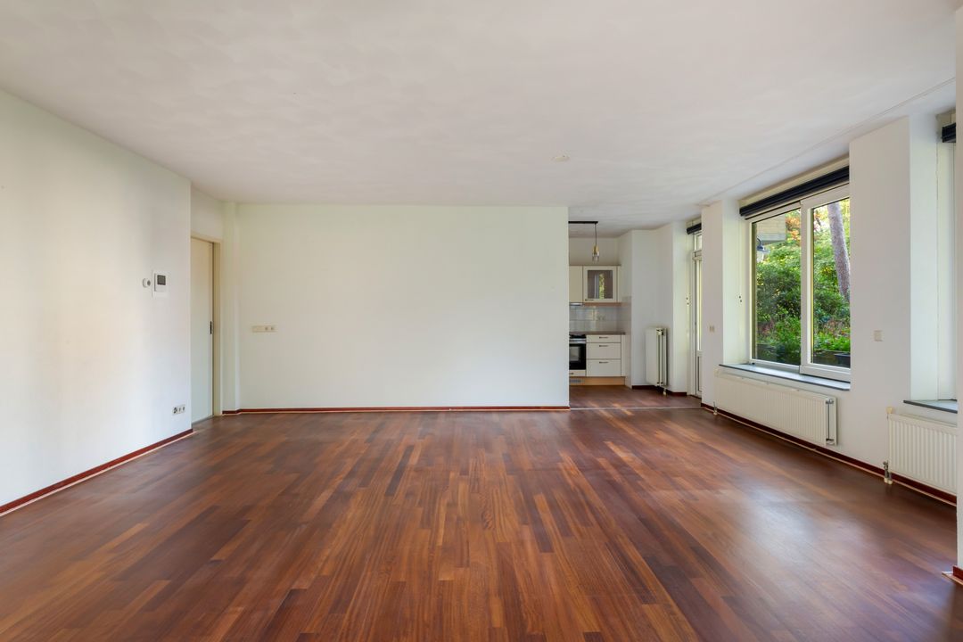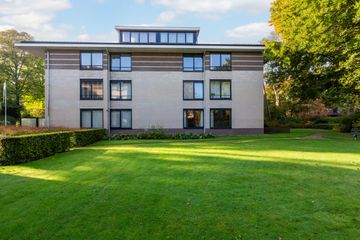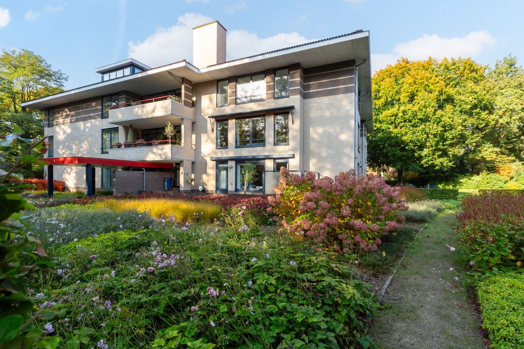 Entree appartement. Ruime hal waarvandaan alle vertrekken te bereiken zijn. Dit zijn de meterkast, het ruime toilet met fontein, de bijkeuken met aansluitingen was- en droogmachine, c.v. gasketel en bergplanken en de woonkamer. De ruime woonkamer (46 m2) v.v. een prachtige parketvloer, heeft veel ramen waarvandaan uitzicht over het park is. Met name het grote raam aan de oostkant geeft uitzicht over de magnifieke tuin. Vanuit de woonkamer is de halfopen keuken te bereiken. De keuken is voorzien van inbouwapparatuur. Vanuit de keuken is het zeer riante terras te bereiken. Voor degene die op zeer warme en zonnige dagen toch buiten wil zitten is dit terras ideaal omdat er veel schaduw is dankzij de hoge bomen. Er zijn vrijwel geen appartementen die een dergelijke buitenruimte hebben en daarom is dit een uniek pluspunt. Riante ouderslaapkamer (ca. 22 m2) met zijraam waarvandaan er een grandioos uitzicht over het park is. De ruime badkamer is netjes onderhouden, voorzien van ligbad, separate douchegelegenheid, wastafel en radiator. De tweede slaapkamer is aan de andere zijde van het appartement gesitueerd. Dit is een volwaardige slaapkamer / werkkamer.