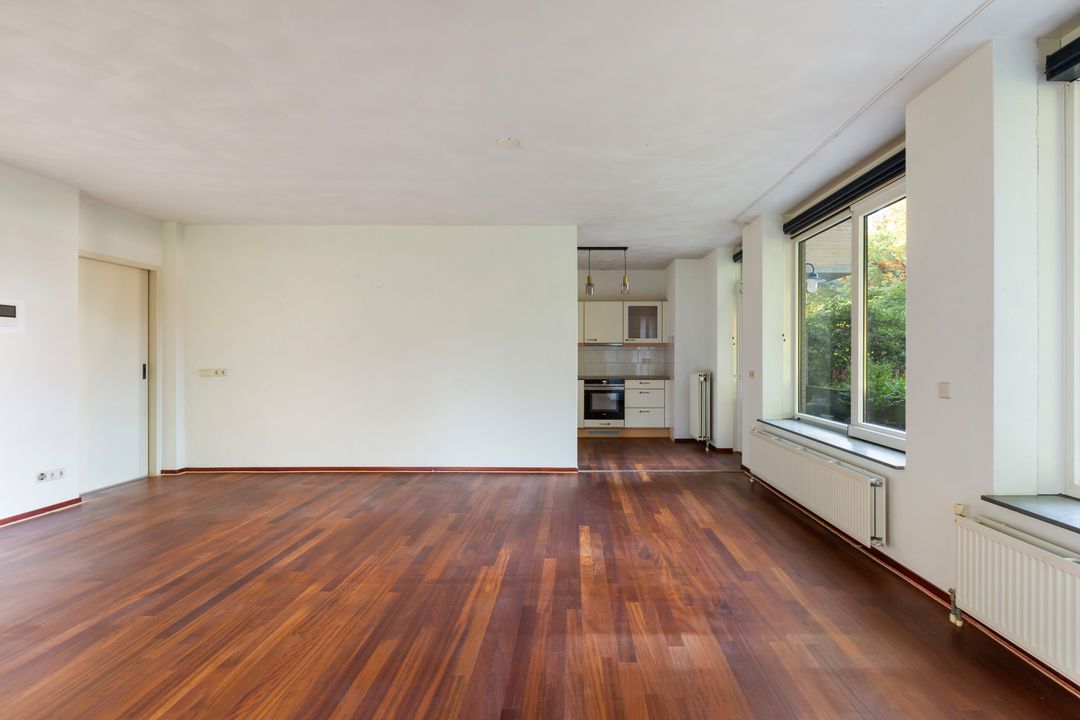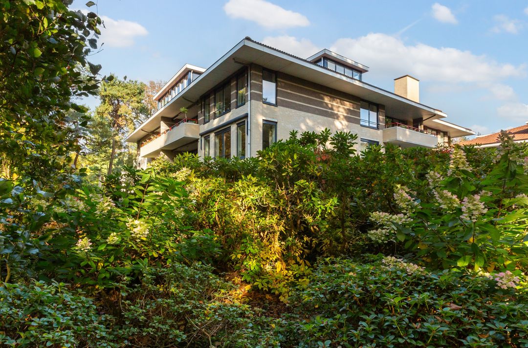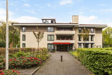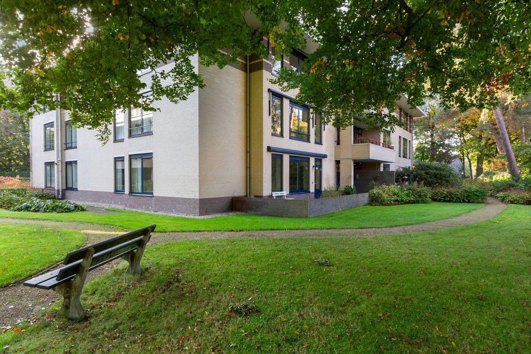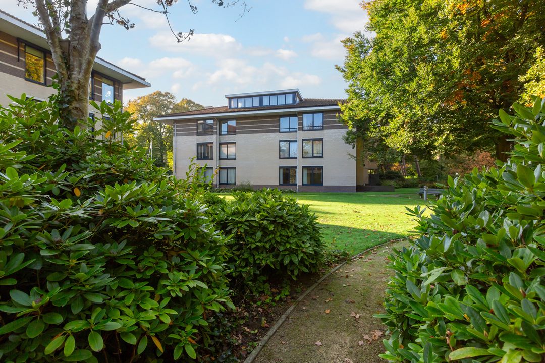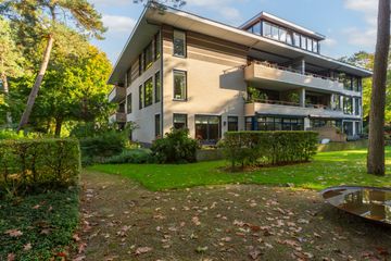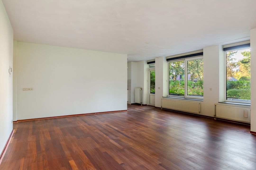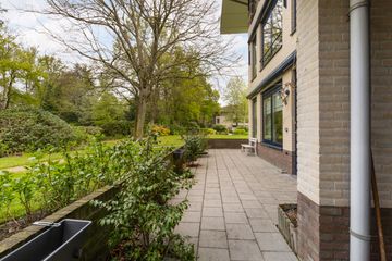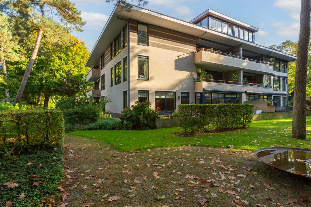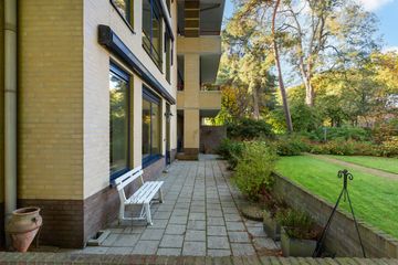 Entree appartement. Ruime hal waarvandaan alle vertrekken te bereiken zijn. Dit zijn de meterkast, het ruime toilet met fontein, de bijkeuken met aansluitingen was- en droogmachine, c.v. gasketel en bergplanken en de woonkamer. De ruime woonkamer (46 m2) v.v. een prachtige parketvloer, heeft veel ramen waarvandaan uitzicht over het park is. Met name het grote raam aan de oostkant geeft uitzicht over de magnifieke tuin. Vanuit de woonkamer is de halfopen keuken te bereiken. De keuken is voorzien van inbouwapparatuur. Vanuit de keuken is het zeer riante terras te bereiken. Voor degene die op zeer warme en zonnige dagen toch buiten wil zitten is dit terras ideaal omdat er veel schaduw is dankzij de hoge bomen. Er zijn vrijwel geen appartementen die een dergelijke buitenruimte hebben en daarom is dit een uniek pluspunt. Riante ouderslaapkamer (ca. 22 m2) met zijraam waarvandaan er een grandioos uitzicht over het park is. De ruime badkamer is netjes onderhouden, voorzien van ligbad, separate douchegelegenheid, wastafel en radiator. De tweede slaapkamer is aan de andere zijde van het appartement gesitueerd. Dit is een volwaardige slaapkamer / werkkamer.