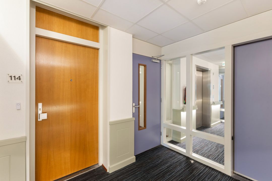 Indeling appartement: Entree appartementengebouw. Centraal bellenplateau, brievenbussen en centrale hal. De centrale hal is onlangs vernieuwd en gemoderniseerd. Voor dit appartement is de lift niet nodig, het is immers op de begane grond gesitueerd. Wel is de liftinstallatie hiervandaan te bereiken.