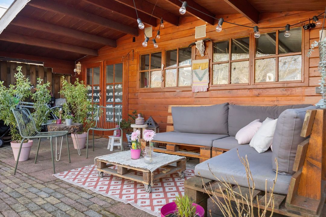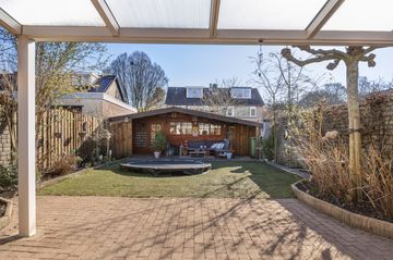 De woning heeft een ruime voortuin inclusief oprit en parkeergelegenheid, achterom naar de ruime diepe achtertuin op het Zuid-Oosten gelegen en houten chalet met aparte berging veranda.
