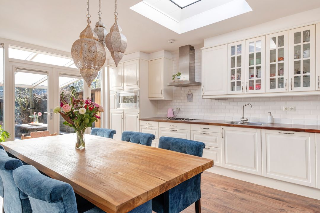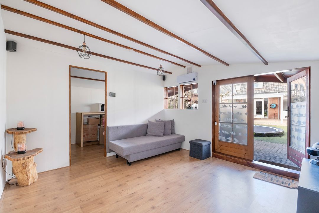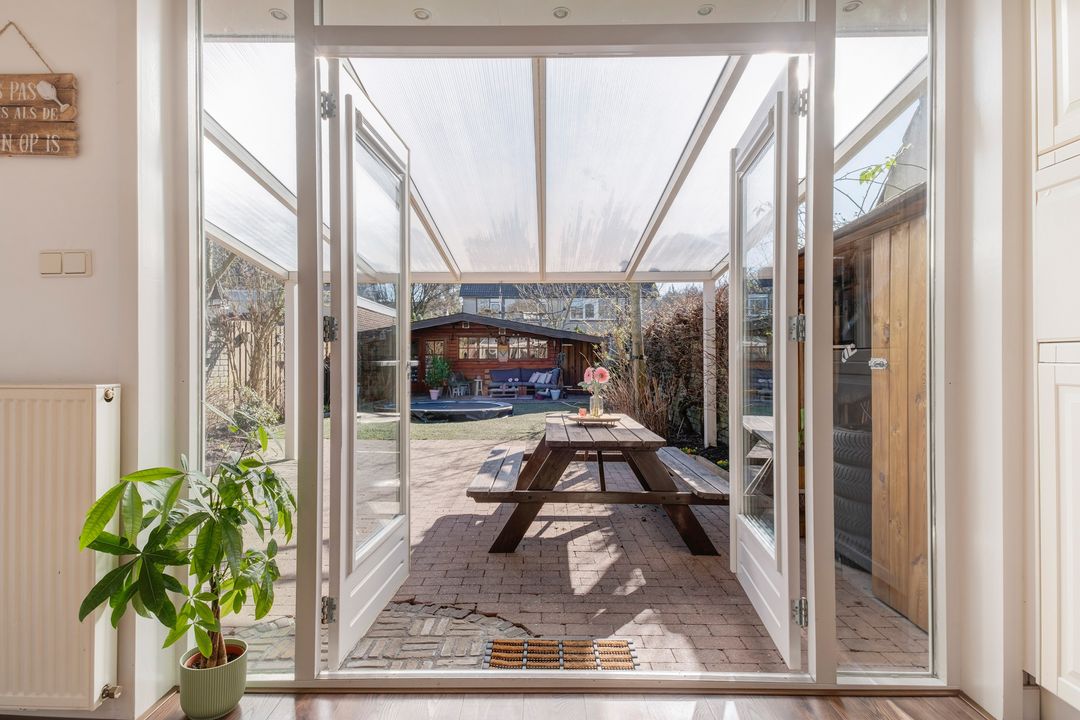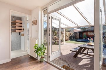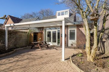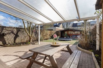 Langs de volledige zijkant van de woning plus over de gehele breedte is de woning 5 meter uitgebouwd waardoor er ruimte is gecreëerd voor ruime badkamer en woonkeuken daarnaast is er een bijzonder grote terrasoverkapping (23,5m2) gebouwd wat uw woongenot aanzienlijk vergroot.