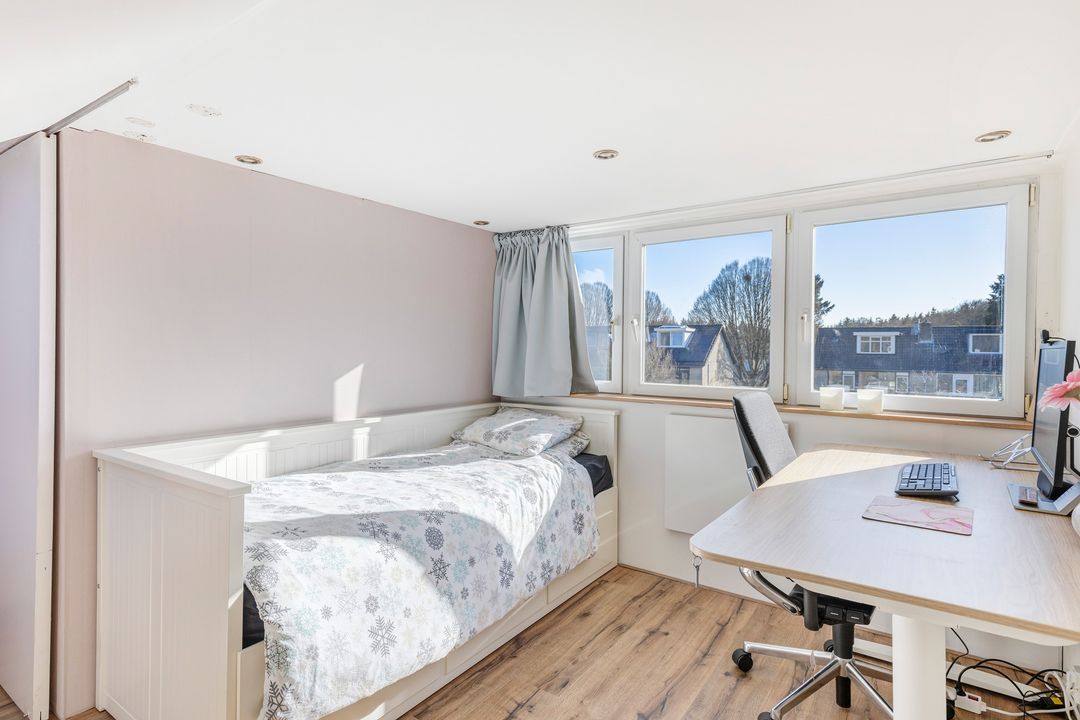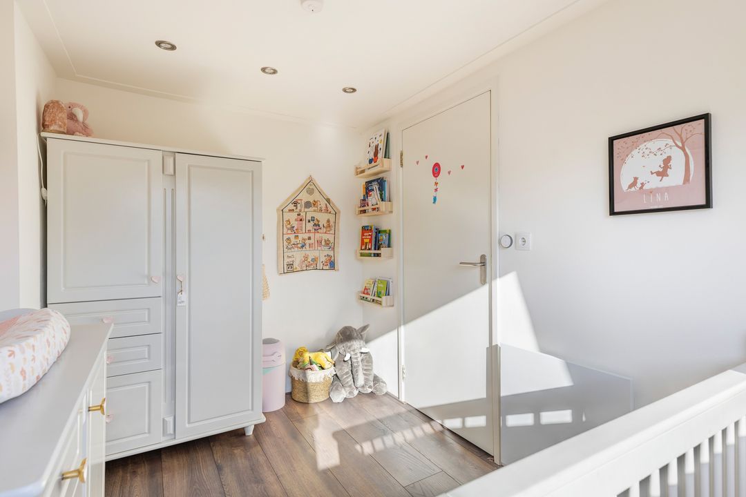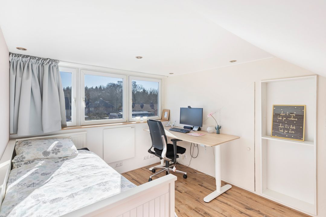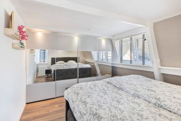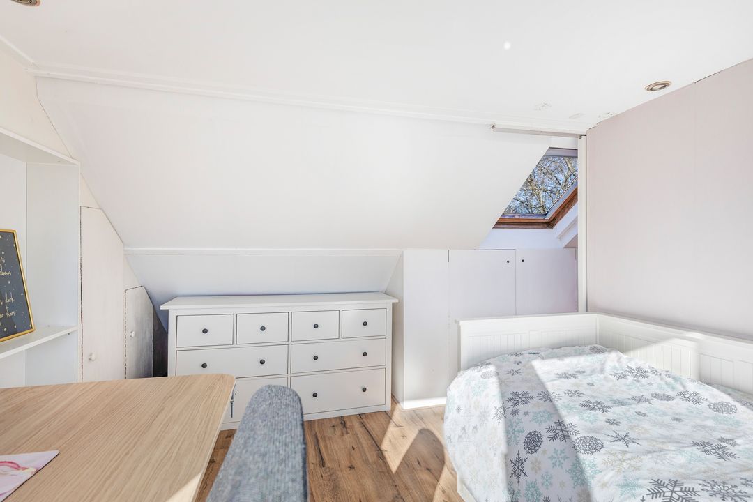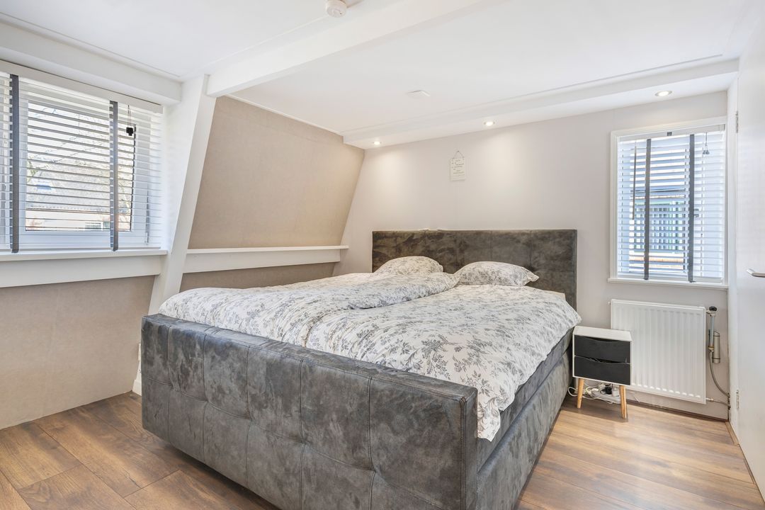 2e verdieping: ruime slaapkamer met groot dakkapel waardoor er veel lichtinval is gecreëerd en veel opbergruimte in de vaste kasten en berging.