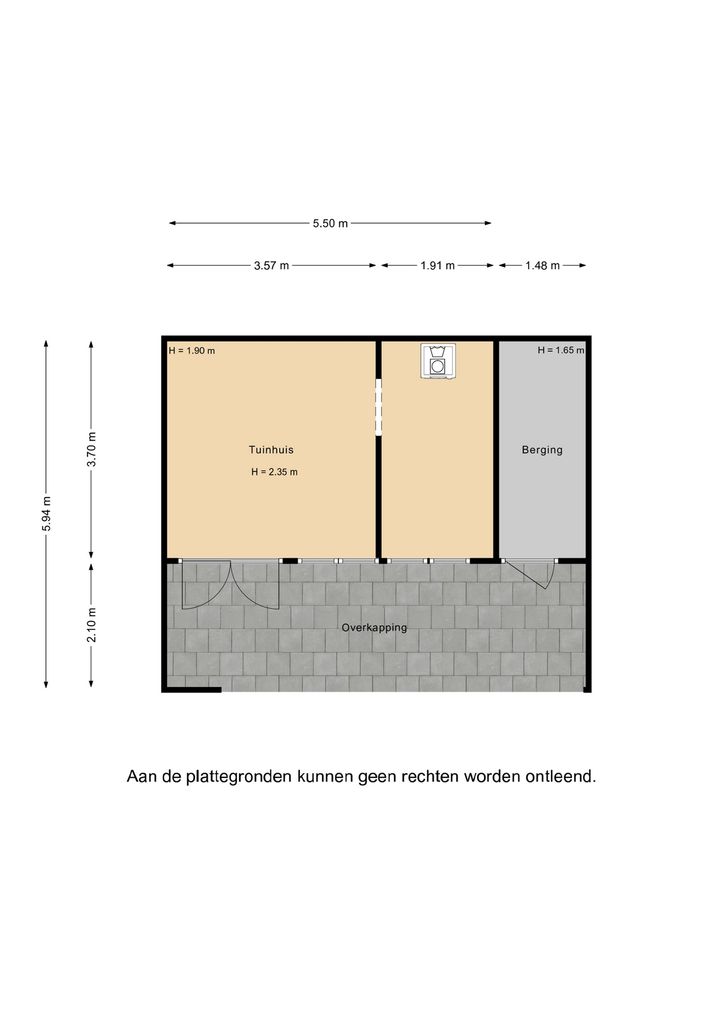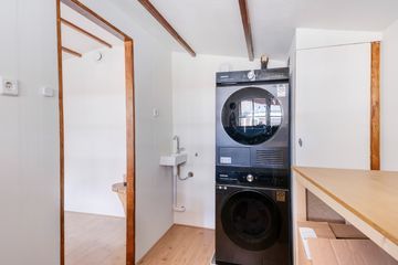 Het houten vrijstaande chalet van 26,2 m2 is geïsoleerd en heeft eigen stroom voorziening, de wasmachine en droger zijn hier aangesloten, aan de rechter zijde van het chalet is een schuur waar ruimte is gecreëerd om te knutselen of voldoende ruimte voor fietsen.