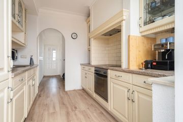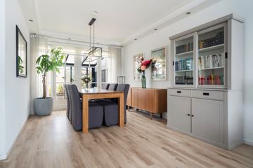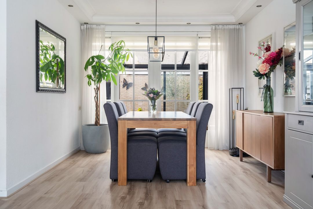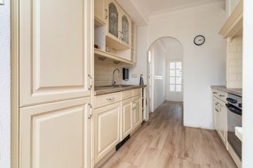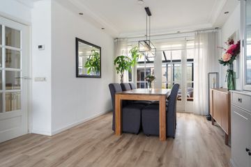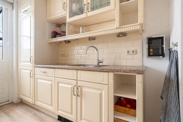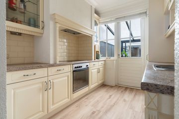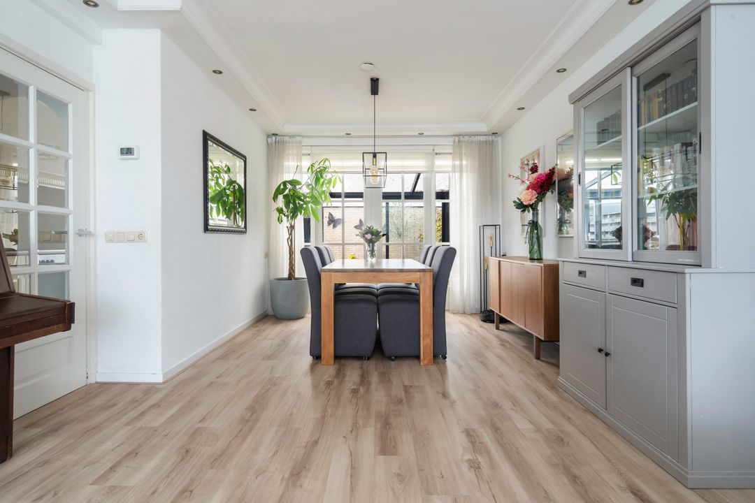 Er ligt een lichte laminaatvloer die de ruimte een moderne sfeer geeft. Aan de achterzijde zijn er openslaande deuren naar de serre in de achtertuin. Deze deuren hebben een fraaie roedeverdeling. De keuken aan de achterzijde van de woning heeft een nette parallel opstelling met inbouwapparatuur en een deur naar de serre in de achtertuin.