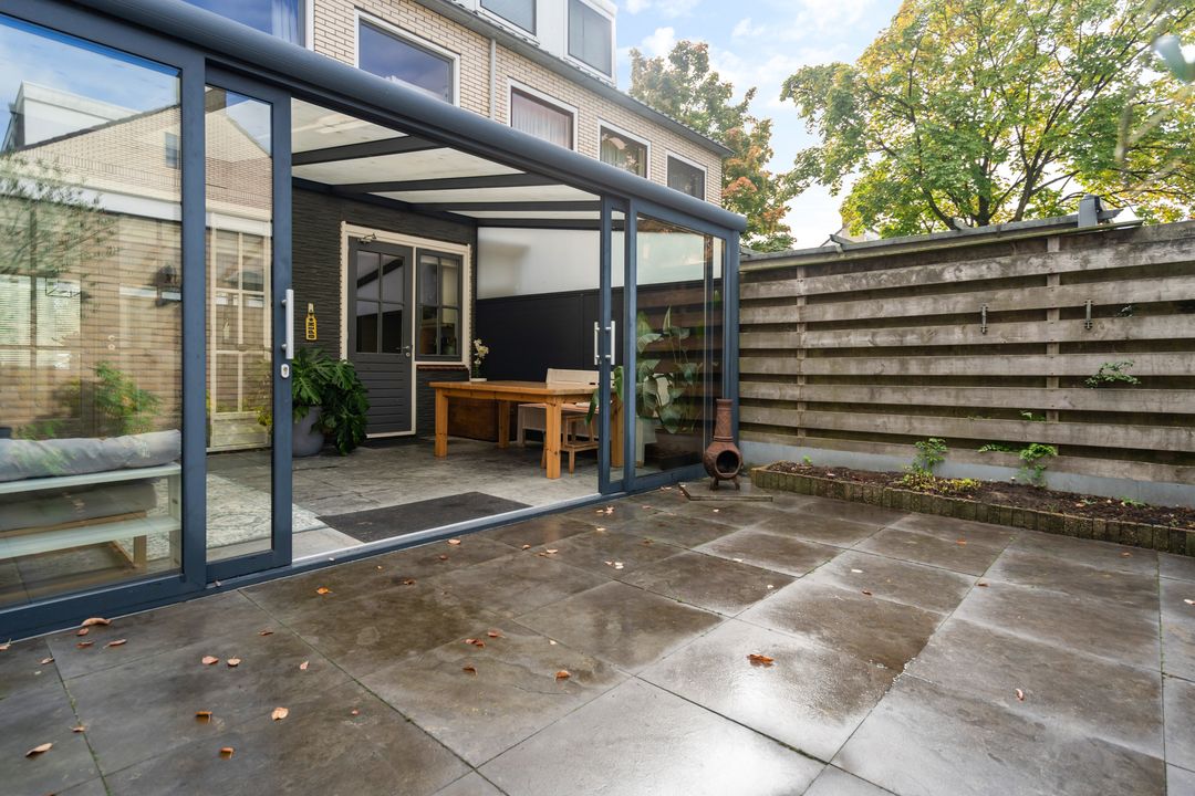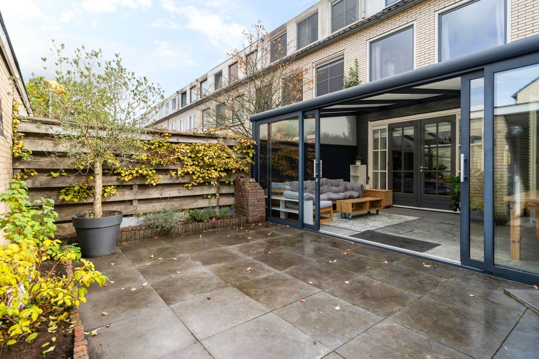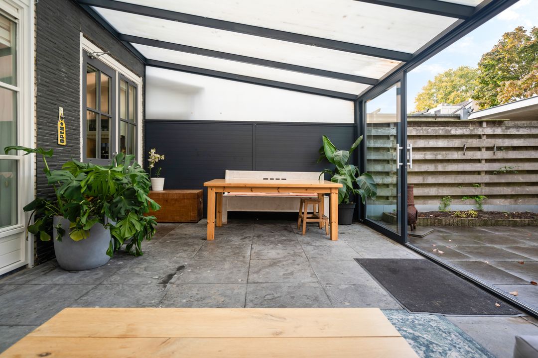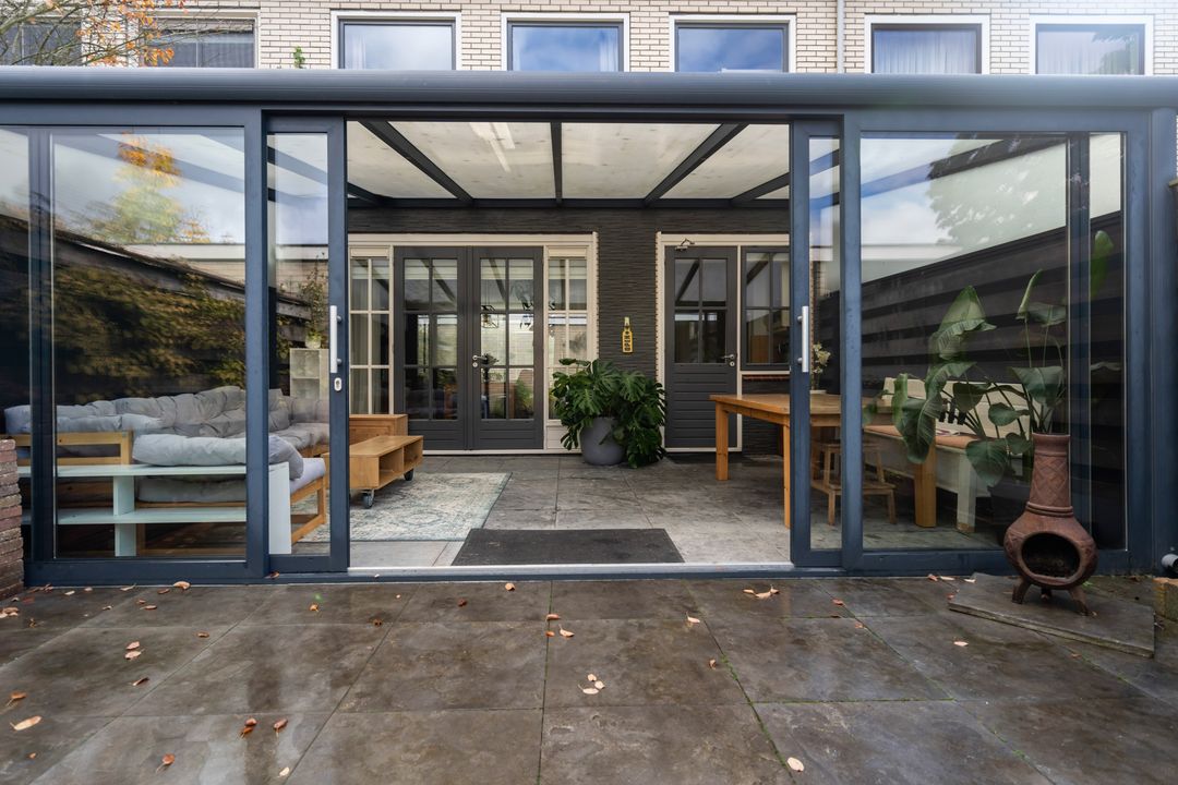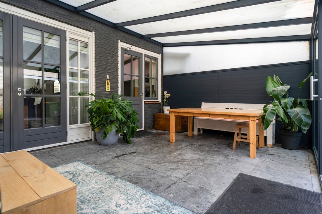 Hier liggen grijze terrastegels en middels een glazen schuifpui is de serre af te sluiten. Een heerlijke plek die zelfs in de koudere seizoenen te gebruiken is.
