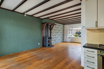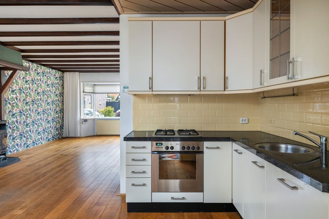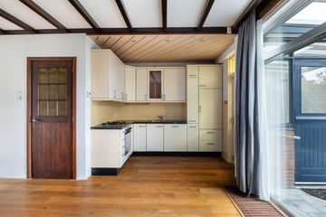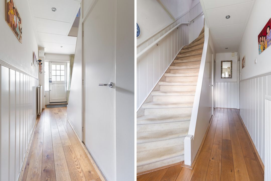 Entree, gang, toegang tot kelder, doorzonwoonkamer met erker en massief eiken vloer, in het midden van de woonkamer staat een mooie houtkachel, halfopen keuken met inbouwapparatuur. Vanuit de keuken bereikt u via de hal, het toilet, de achtertuin, de ruime bijkeuken en de garage. Via de woonkamer loopt u, d.m.v. een schuifpui, rechtstreeks de zonnige achtertuin in. Aan de achtergevel is een grote overkapping gerealiseerd.