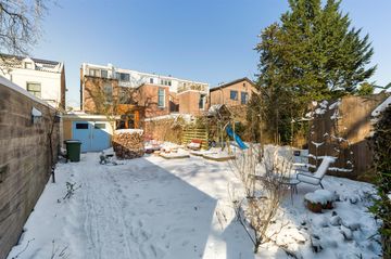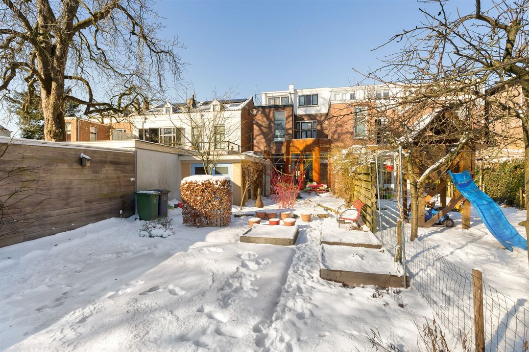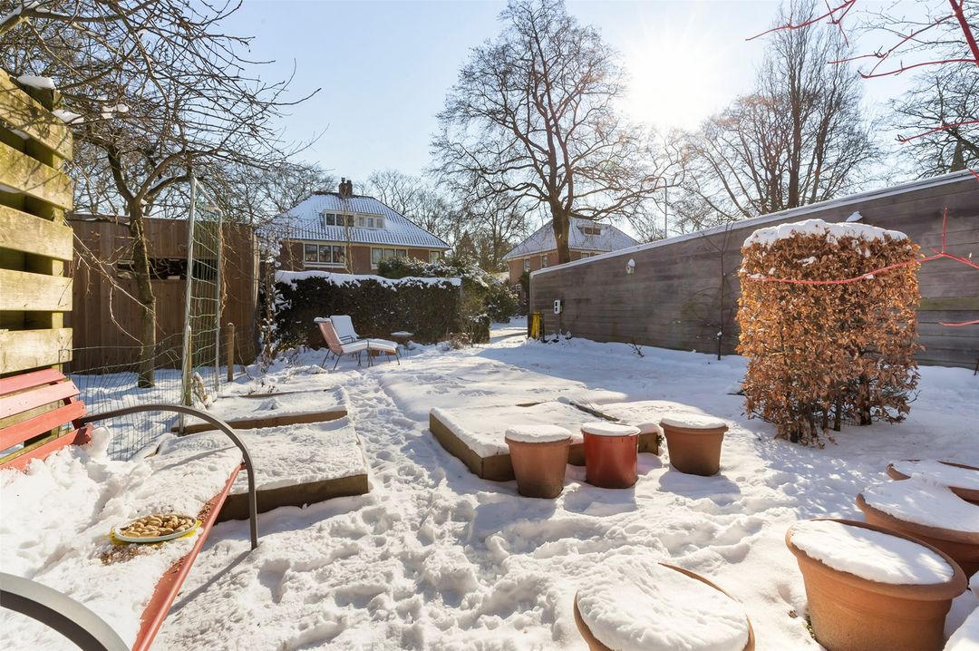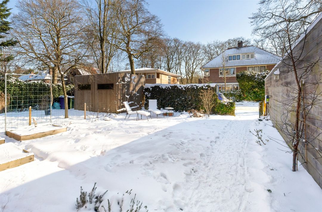 Mooi aangelegde zonnige achtertuin, 22 meter diep met diverse terrassen. Schuur en achteringang aan Lorentzlaan. Alhier een parkeerplaats met elektrische laadpaal op eigen terrein.