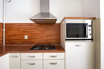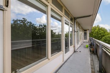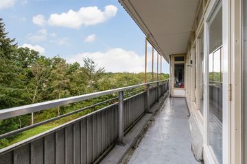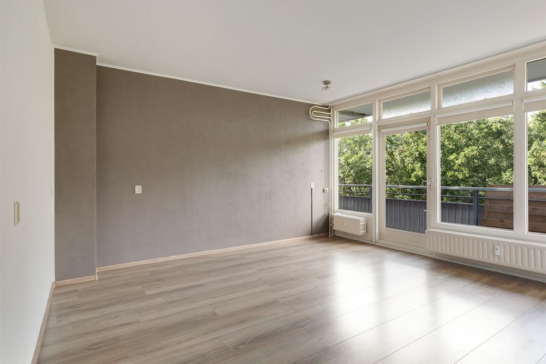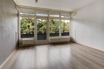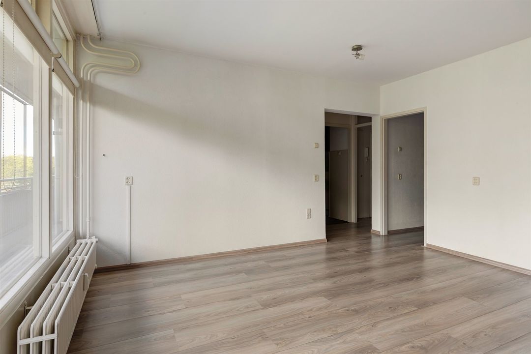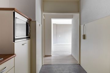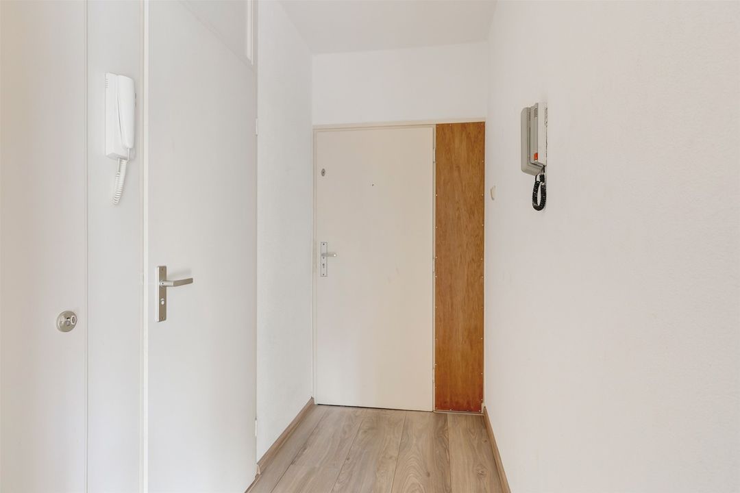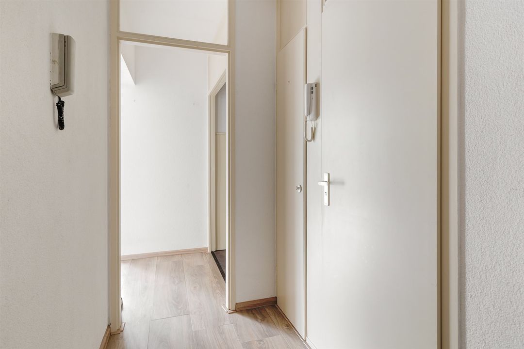 Entree/hal met meterkast en intercom, direct rechts toegang tot de gemoderniseerde badkamer met toilet, wastafel, aansluitpunten voor uw witgoed en een aparte douche. Een nette keuken, een grote en lichte woonkamer met een laminaatvloer, welke toegang geeft tot het balkon met uitzicht op het groen, er is een aparte slaapruimte gecreëerd v.v. laminaat en kastenwand.