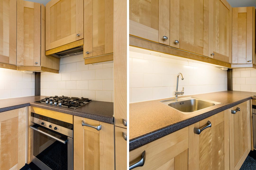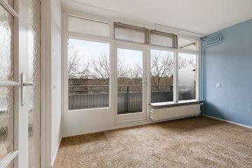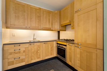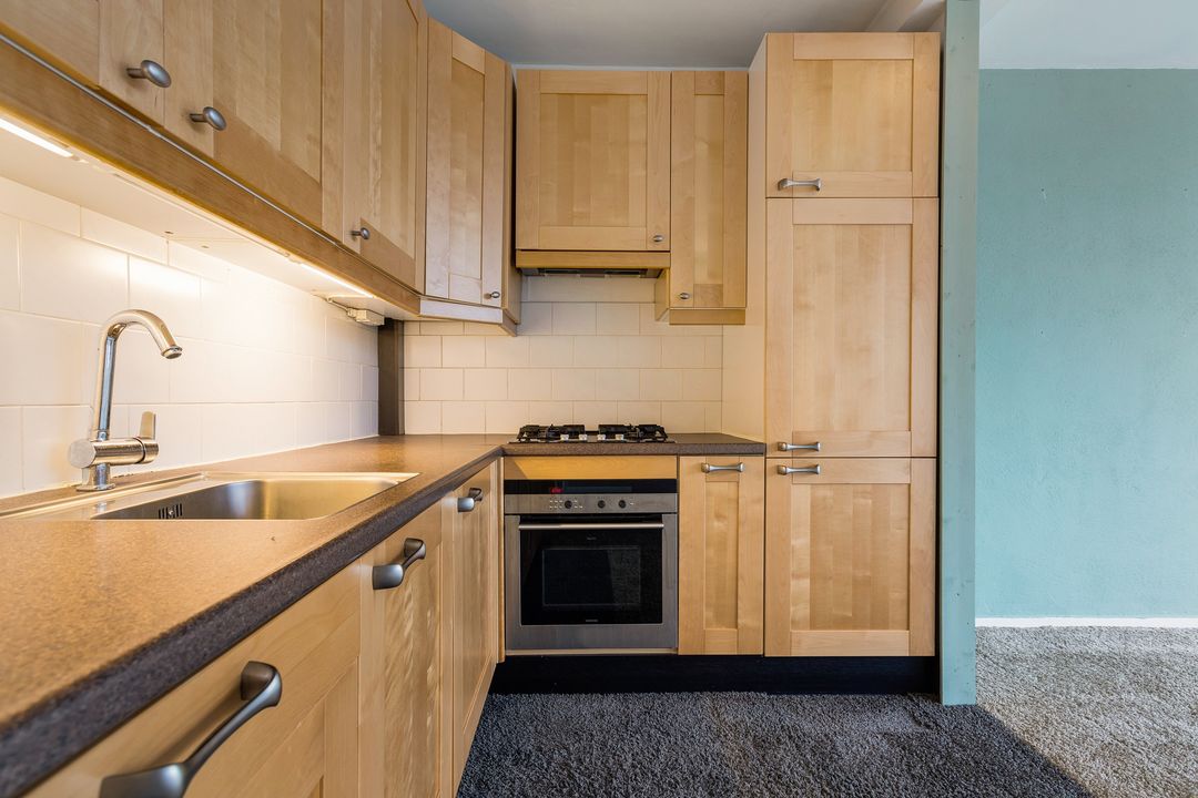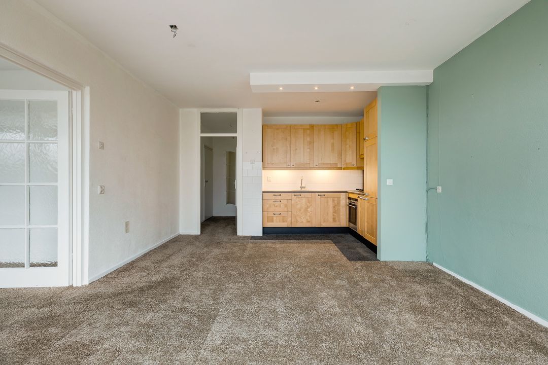 Hal, badkamer met douche toilet en wasmachine aansluiting. Woonkamer met zeer nette open keuken v.v. diverse inbouwapparatuur en een verstrekkend uitzicht tot aan Utrecht, aangrenzend de slaapkamer.