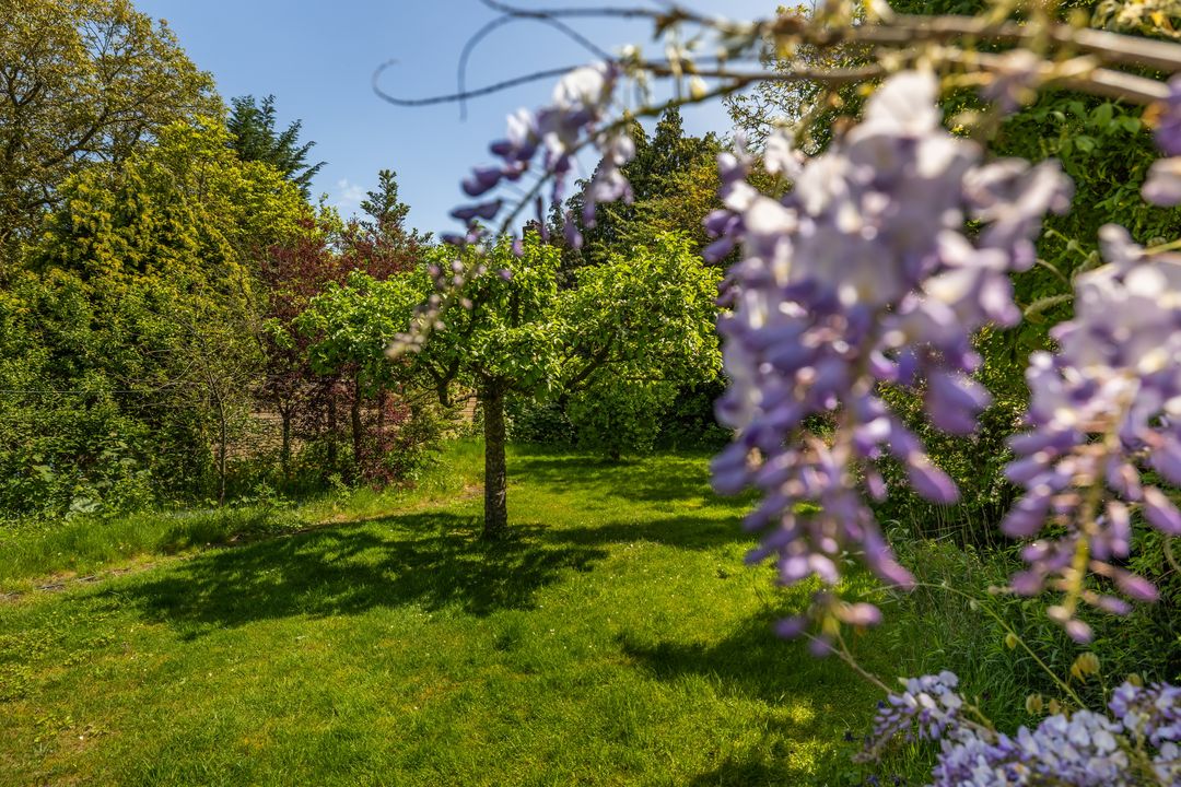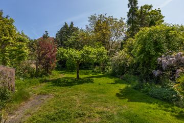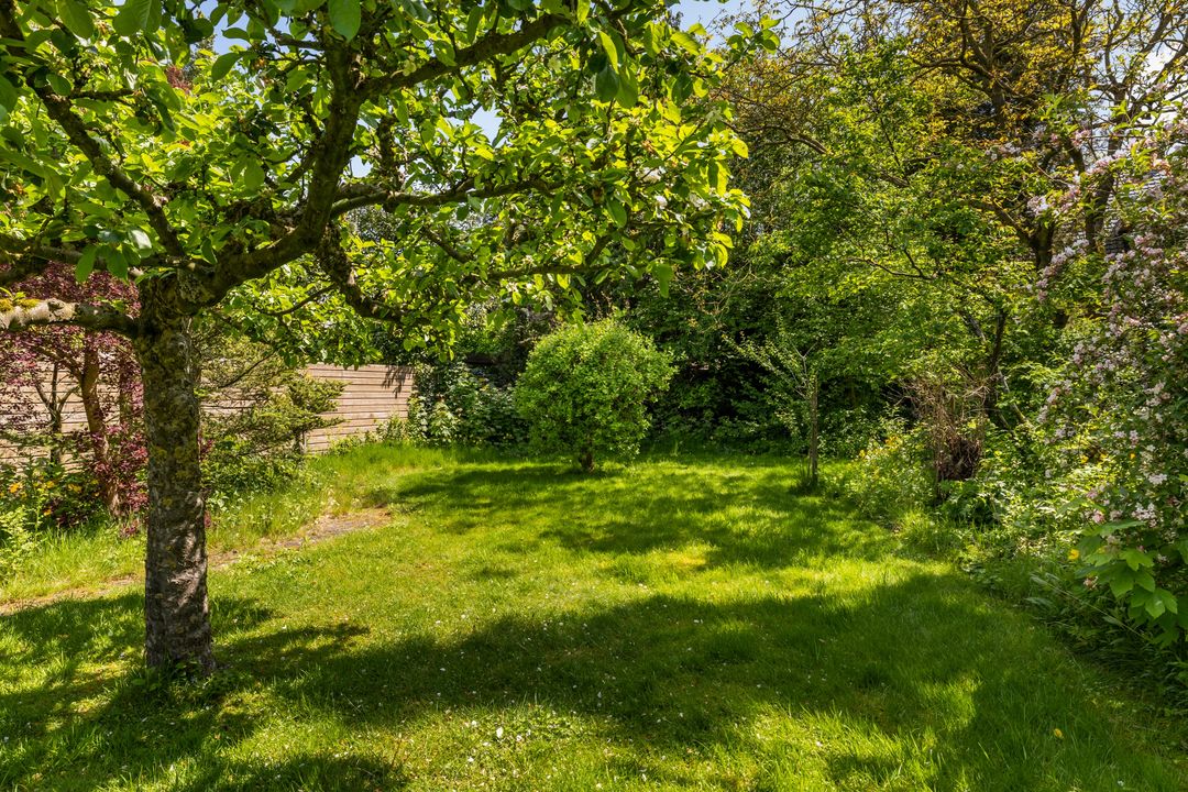 Mooie diepe tuin met een mooie appelboom en bramen en kersen en een zeer grote walnotenboom. Groot Gazon. Erfafscheidingen in eigendom en op eigen perceel.