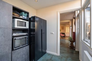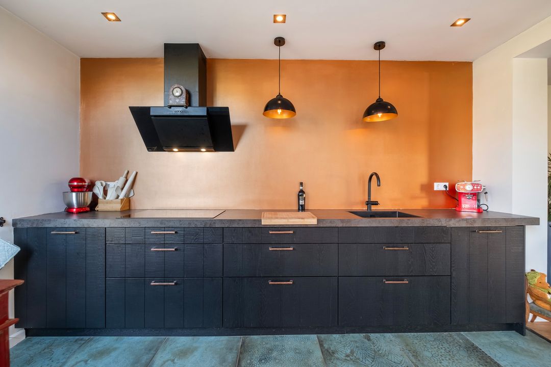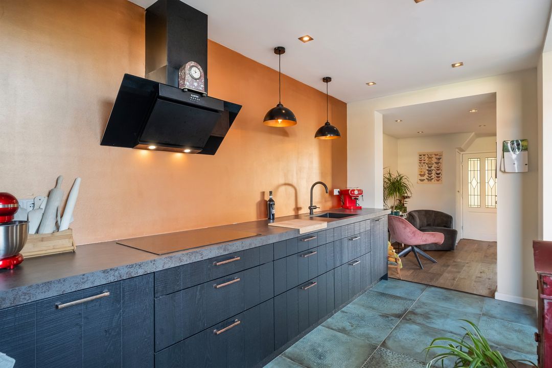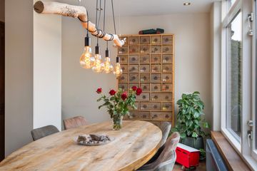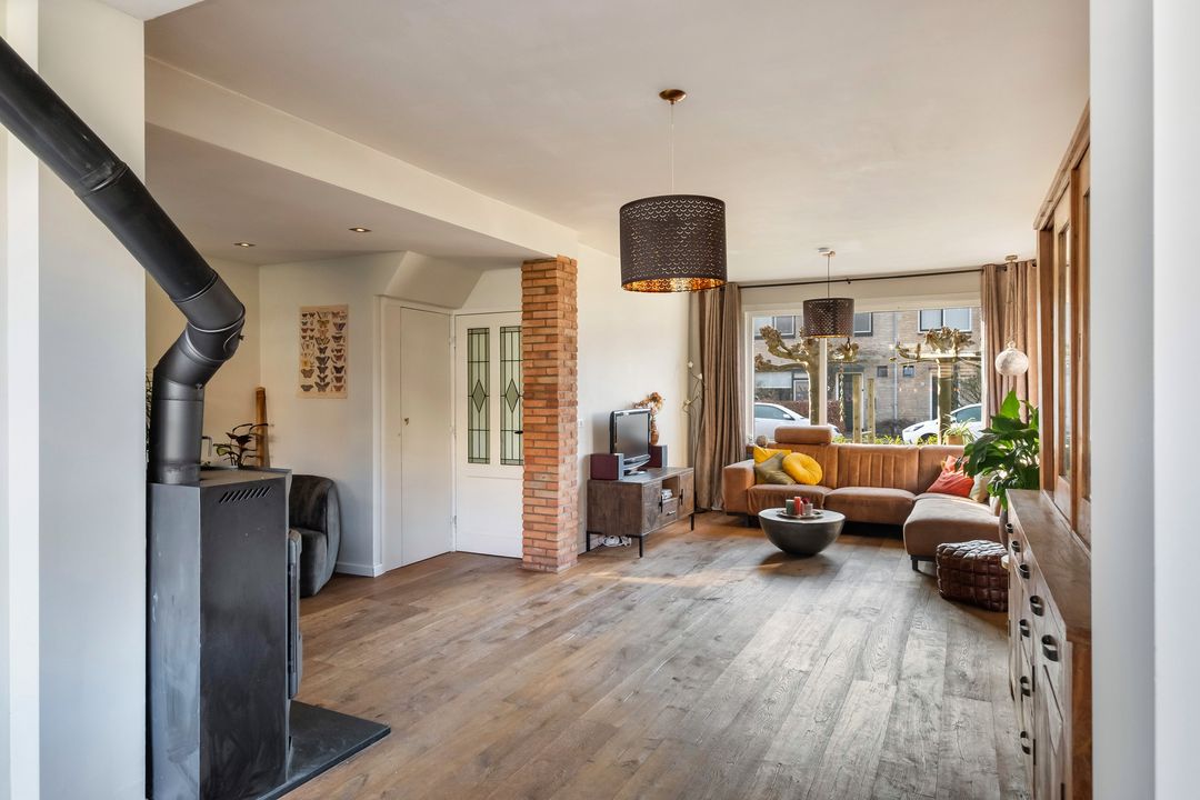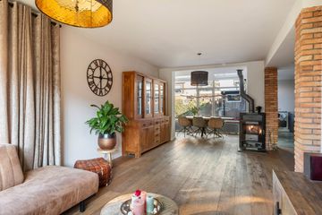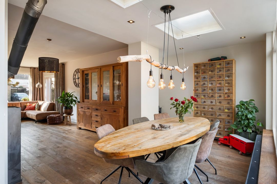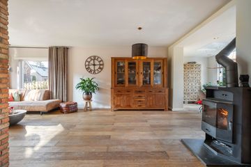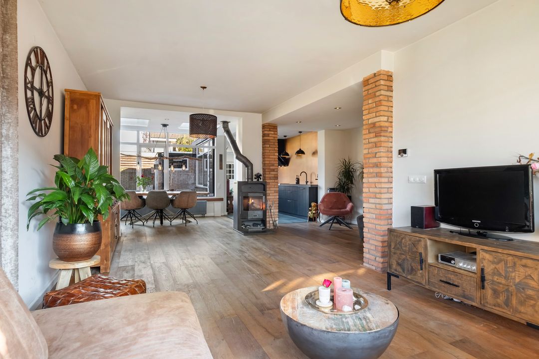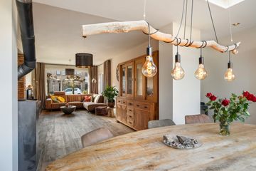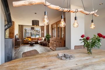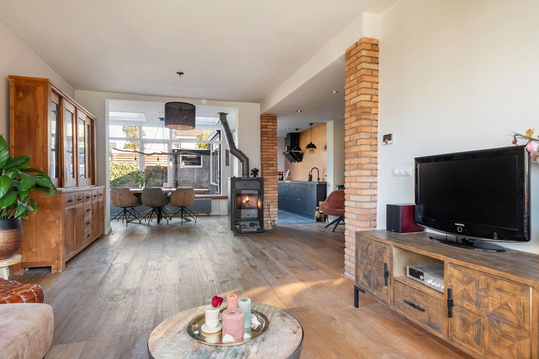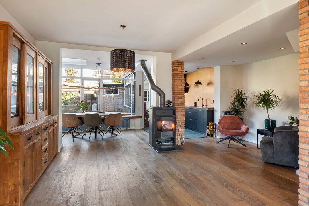Als u binnenkomt in de woning voelt u gelijk een zee van ruimte in de uitgebouwde woonkamer met open keuken, maar tevens het heerlijke knusse gevoel van een echt gezinshuis met in het midden van de ruime woonkamer een prachtige authentieke houtkachel. In de uitbouw is ruimte voor een grote tafel waar u uitgebreid met 10 personen kunt vertoeven. Boven de tafel bevinden zich twee lichtkoepels welke de gehele ruimte voorziet van veel daglicht. De open keuken verbindt serre en woonkamer als centraal punt.