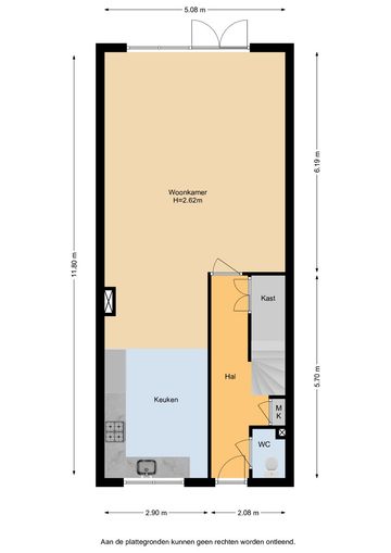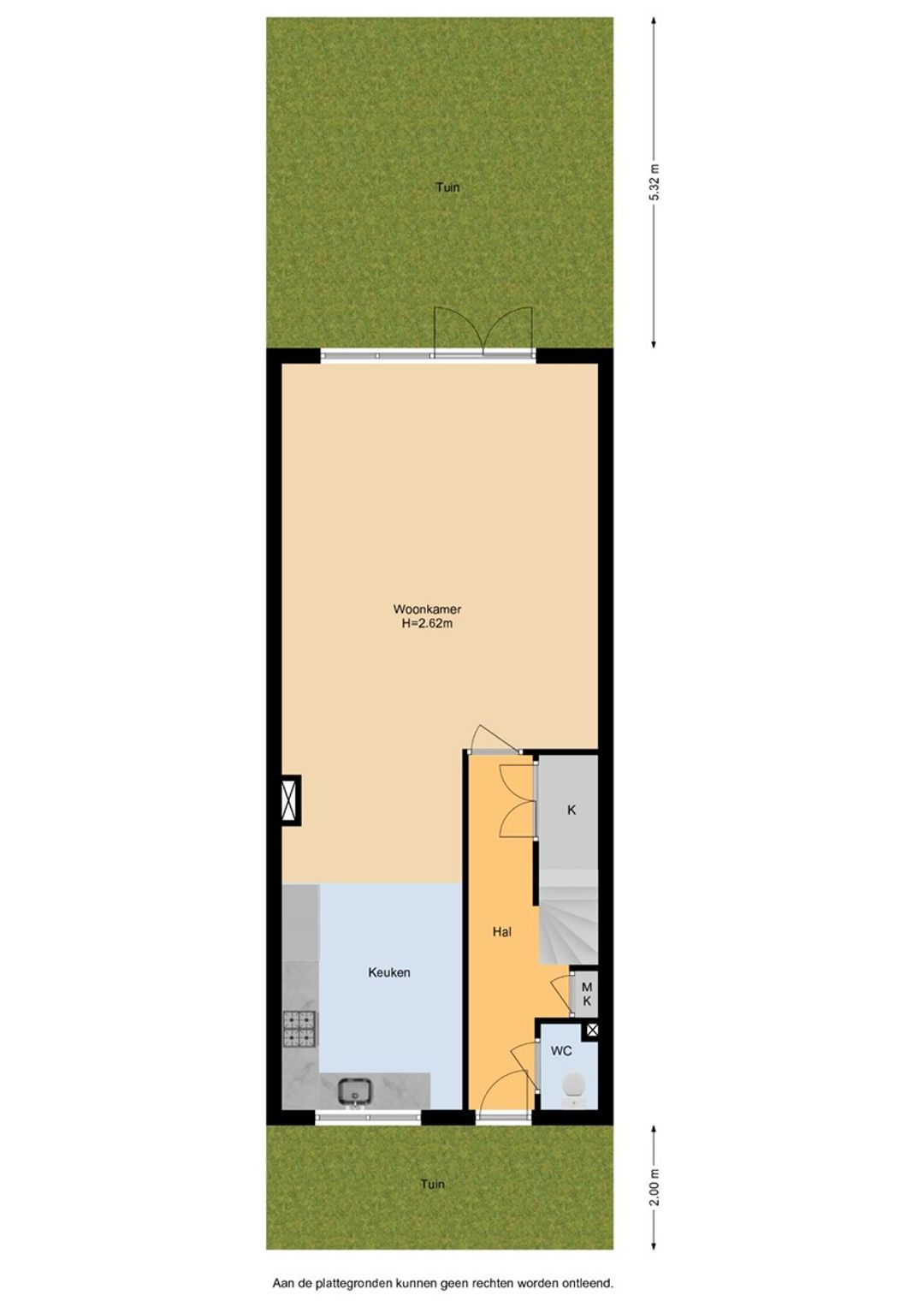 Begane grond: hal, toilet, meterkast, woonkamer met openslaande deuren, open keuken met inbouwapparatuur