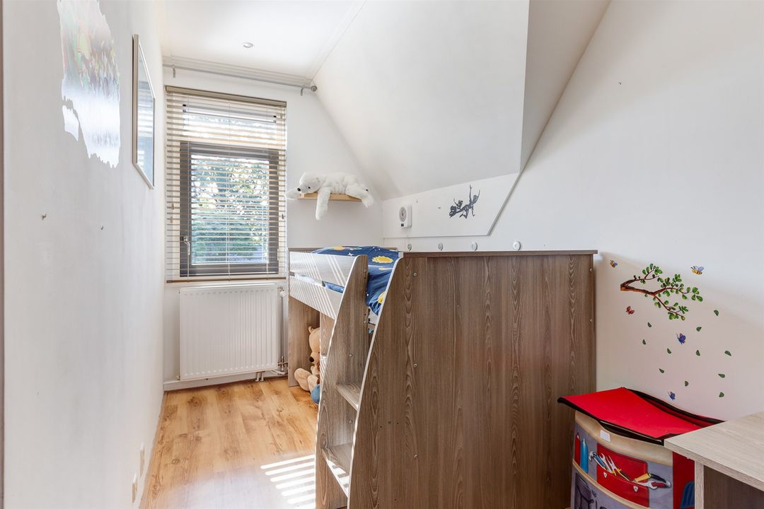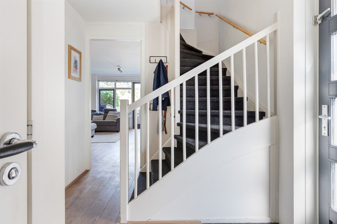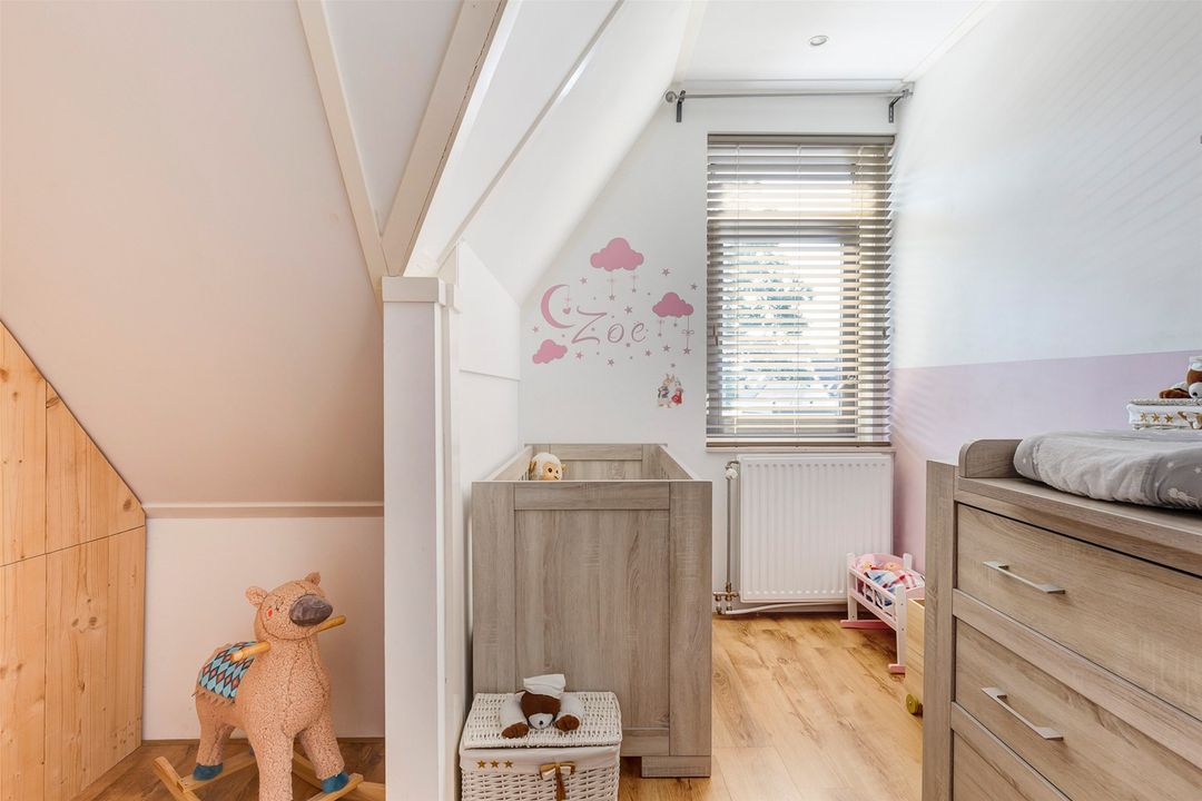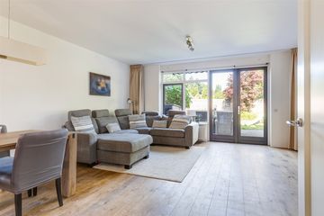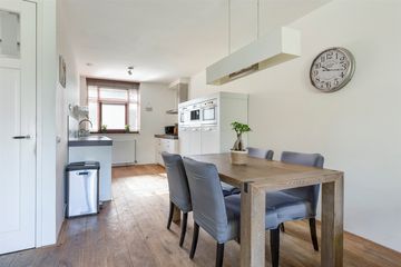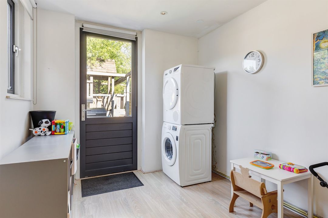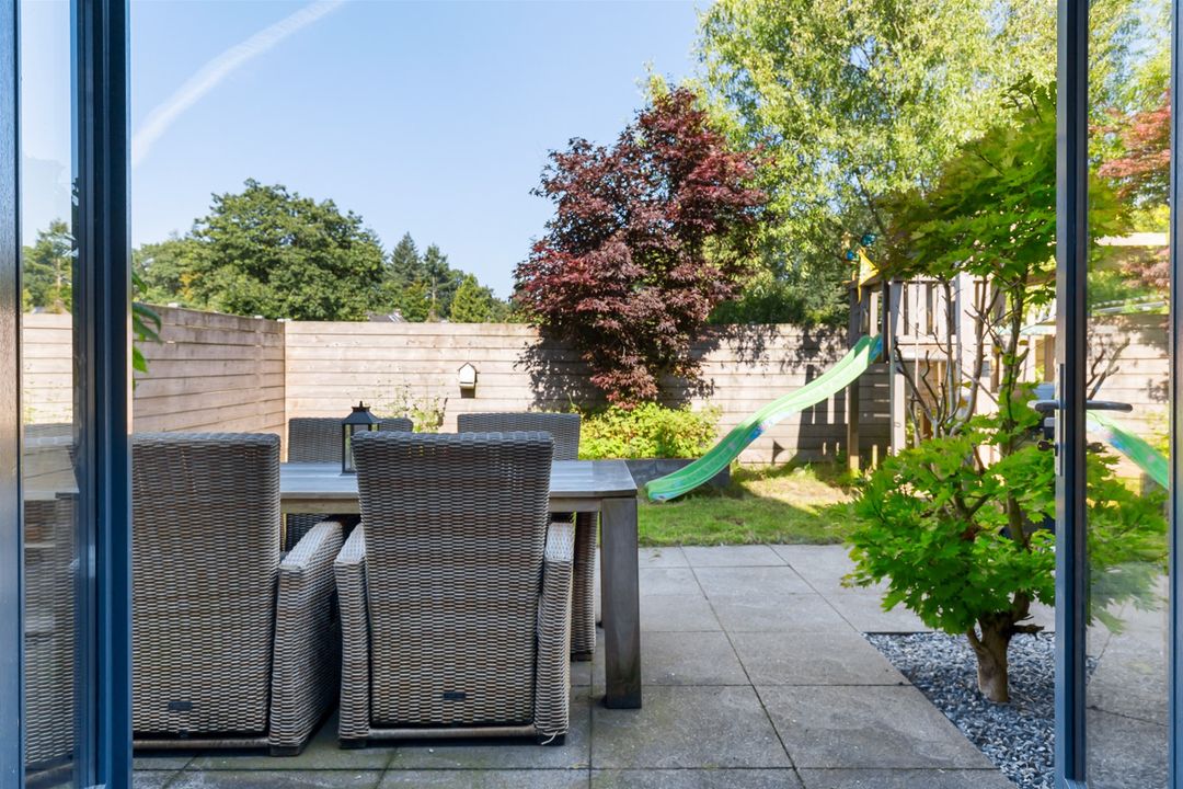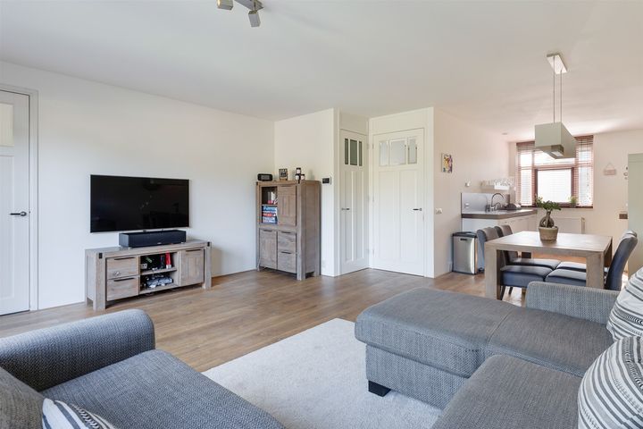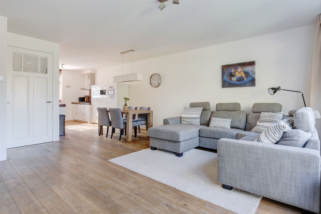 De gehele begane grond is gelegd met Uipkes houten vloeren van massief eiken. De woonkamer met openkeuken heeft openslaande deuren naar de tuin. Een deel van de garage is bij de woonkamer getrokken doormiddel van een deur momenteel in gebruik als kinderkamer/ waskamer.