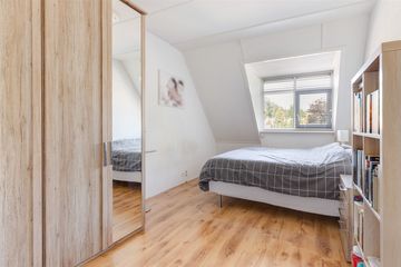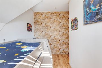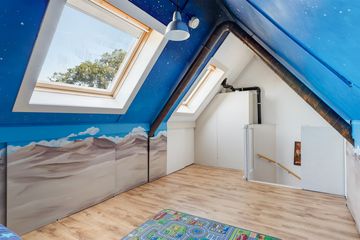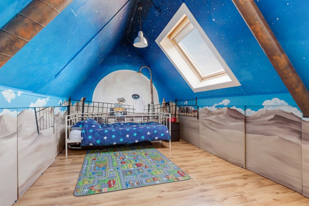 Een ruime zolder, wat op het moment een tienerkamer is, ingericht met bergkasten aan beide zijdes.
