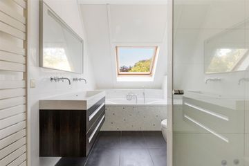 Via de brede luie trap komt u op de ruime overloop, waar zich 3 slaapkamers bevinden en een ruim opgezette badkamer. De badkamer is voorzien van Bisazza Parelmoer glasmozaïek, een aparte douche en bad van Sealskin, Dornbracht kranen en het sanitair van Villeroy en Boch.