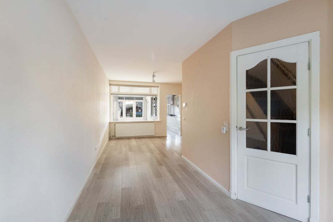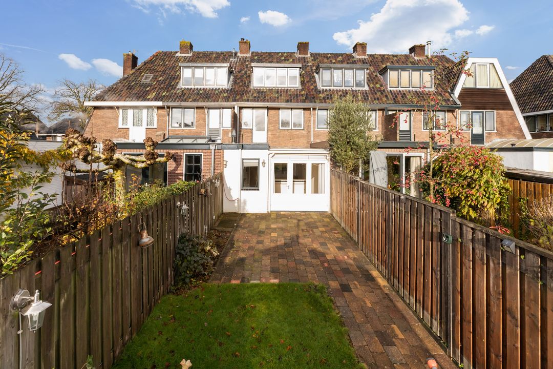 De tussenwoning met een woonoppervlak van 105 m2 heeft een vrij uitzicht over het groenplantsoen.