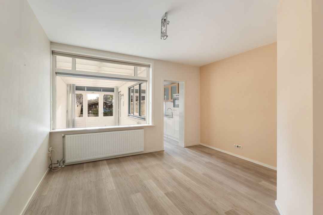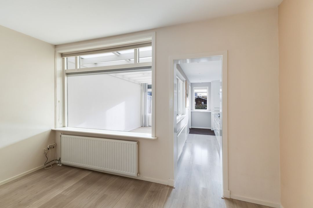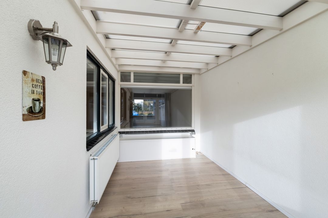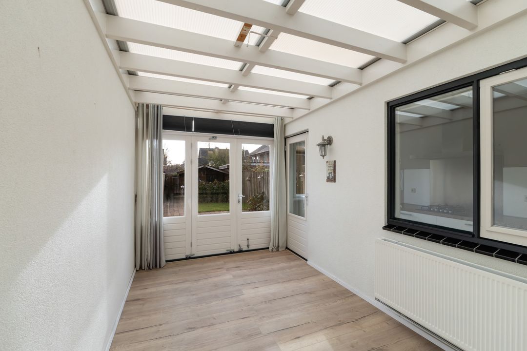 Er is een serre / zitkamer gebouwd tussen de originele achtergevel met raam, de keukengevel met raam en de muur van de uitbouw van de buren. Hiermee is een prima multifunctionele ruimte gecreëerd.