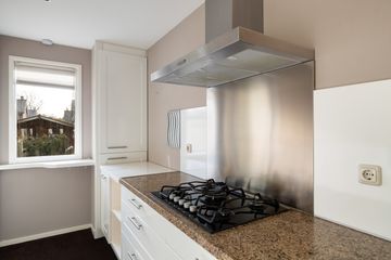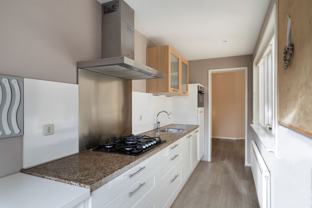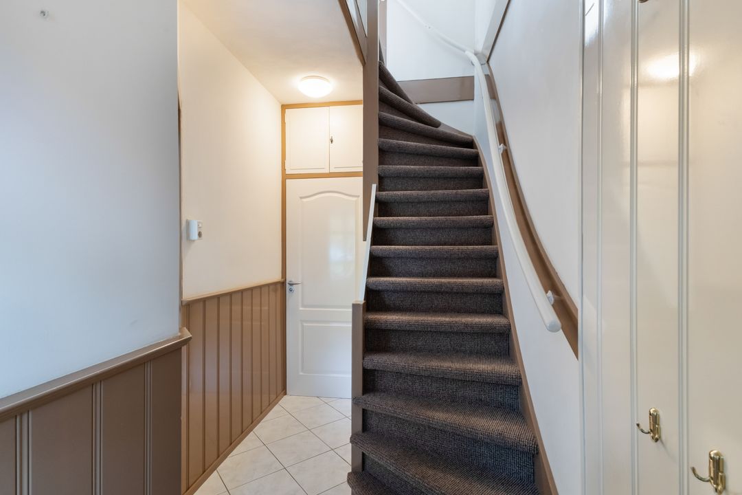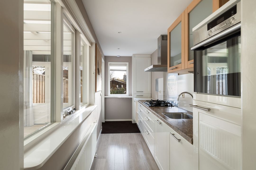 Begane grond: hal, toilet, ruime trapkast, L-vormige woonkamer. De keuken is in de lengte uitgebouwd en heeft hedendaagse kleuren en v.v. een AEG vaatwasser, Siemens combimagnetron, AEG koelkast v.v. zes grote laden.