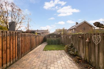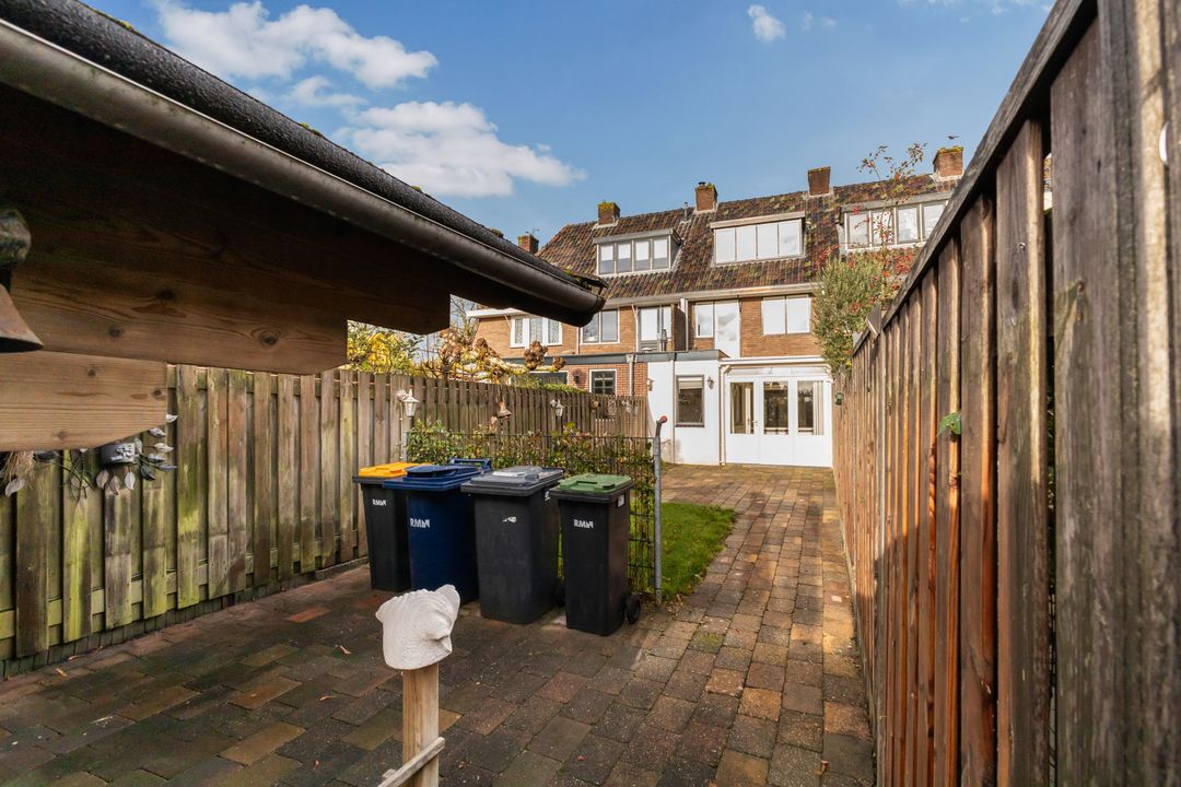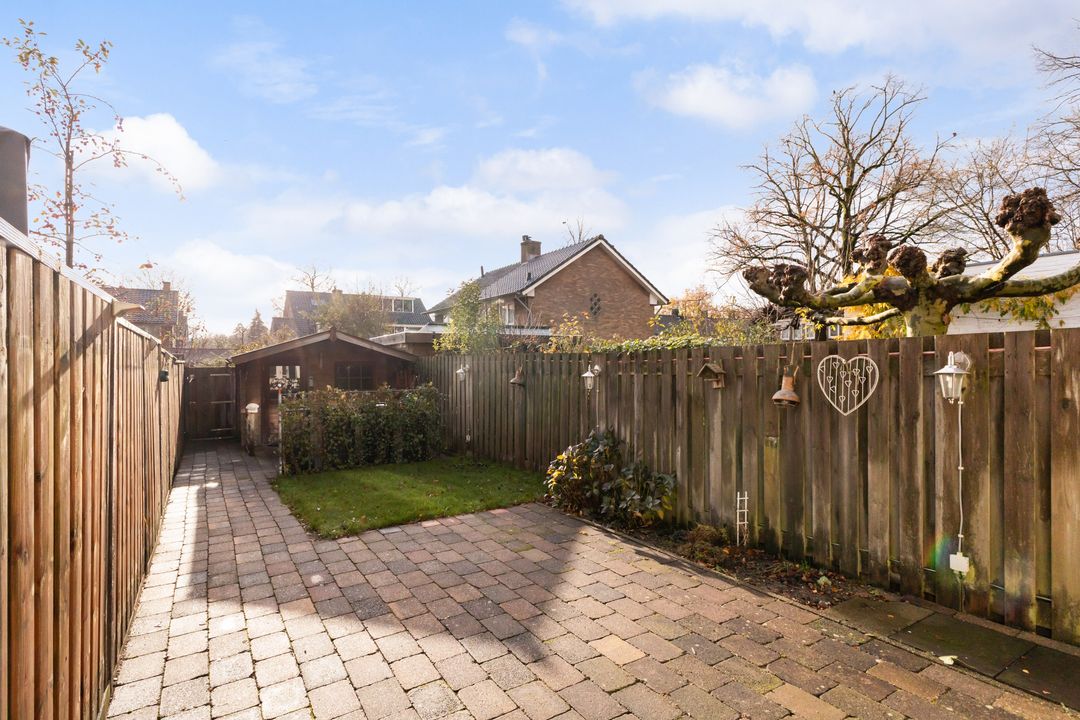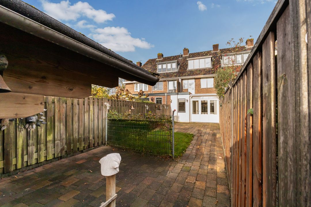 Deur naar de opvallend diepe achtertuin van ca. 80m2, gelegen op het zuidoosten en v.v. een achterom en een prachtig chalet.