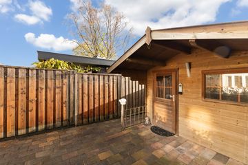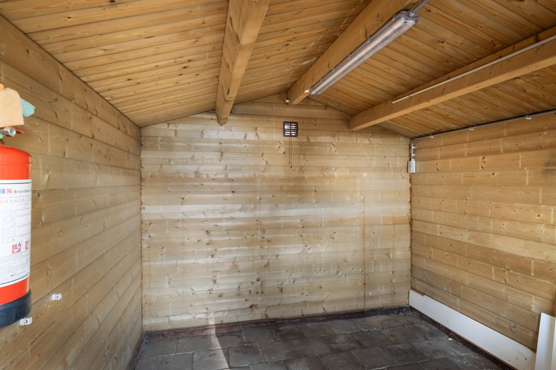 – Grote tuin op het zuidoosten met een achterom en een vrijstaand houten chalet met overkapping